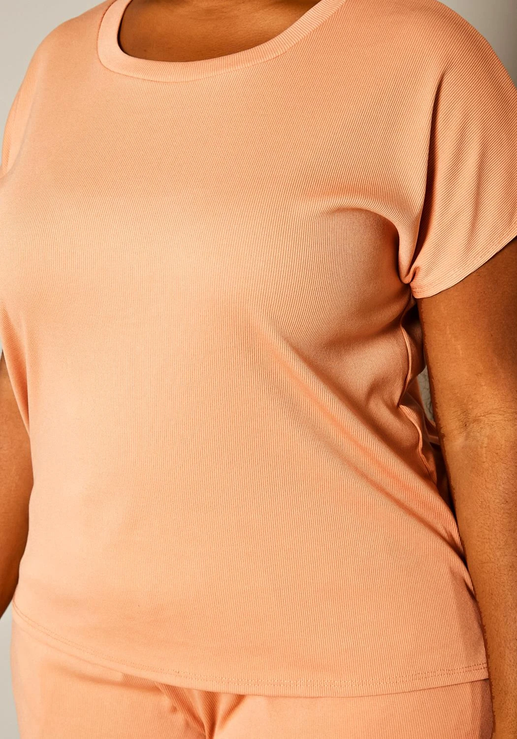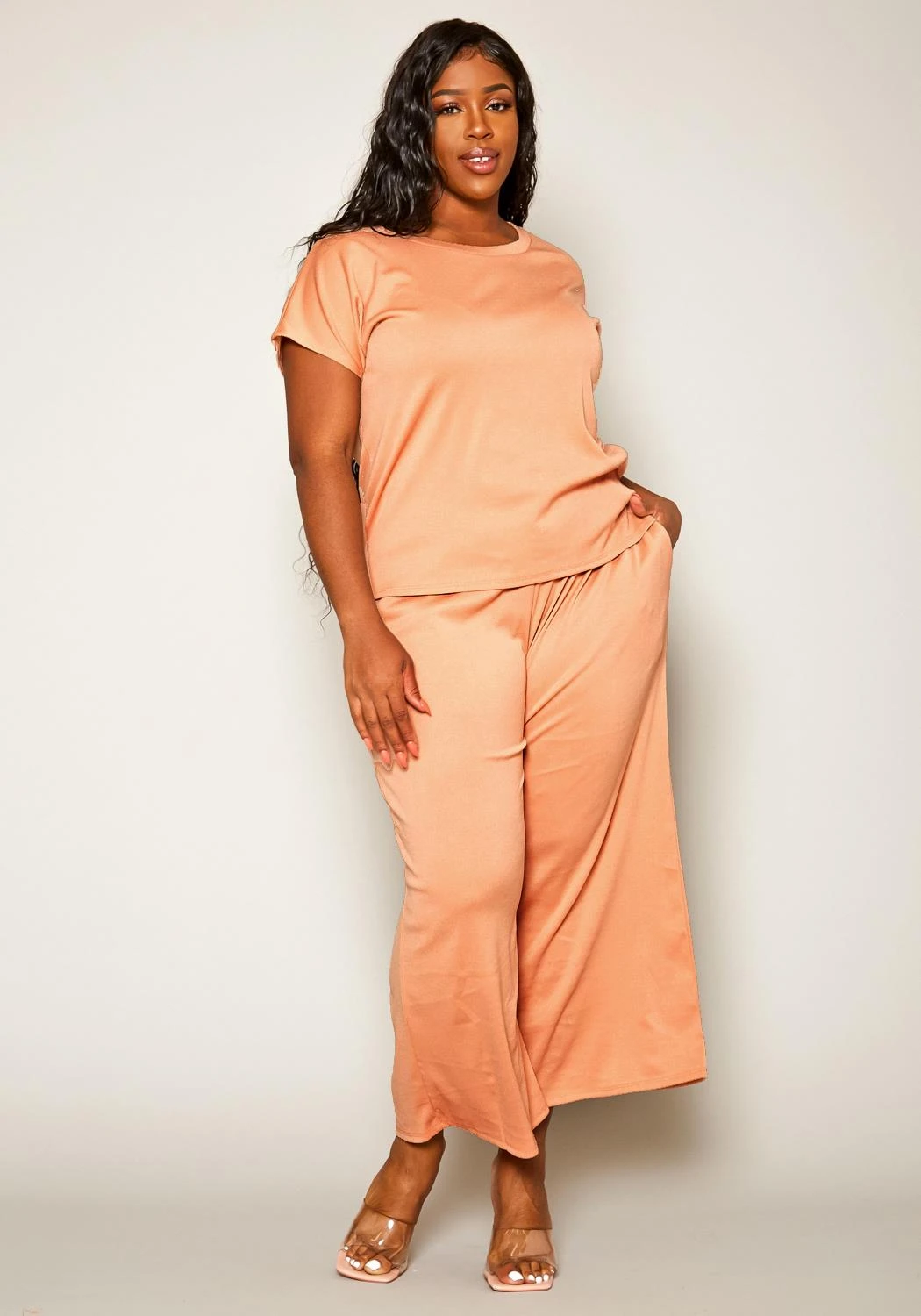 Perfect lounge outfit for plus size women which features a crew neck t-shirt and matching color wide flare pants.