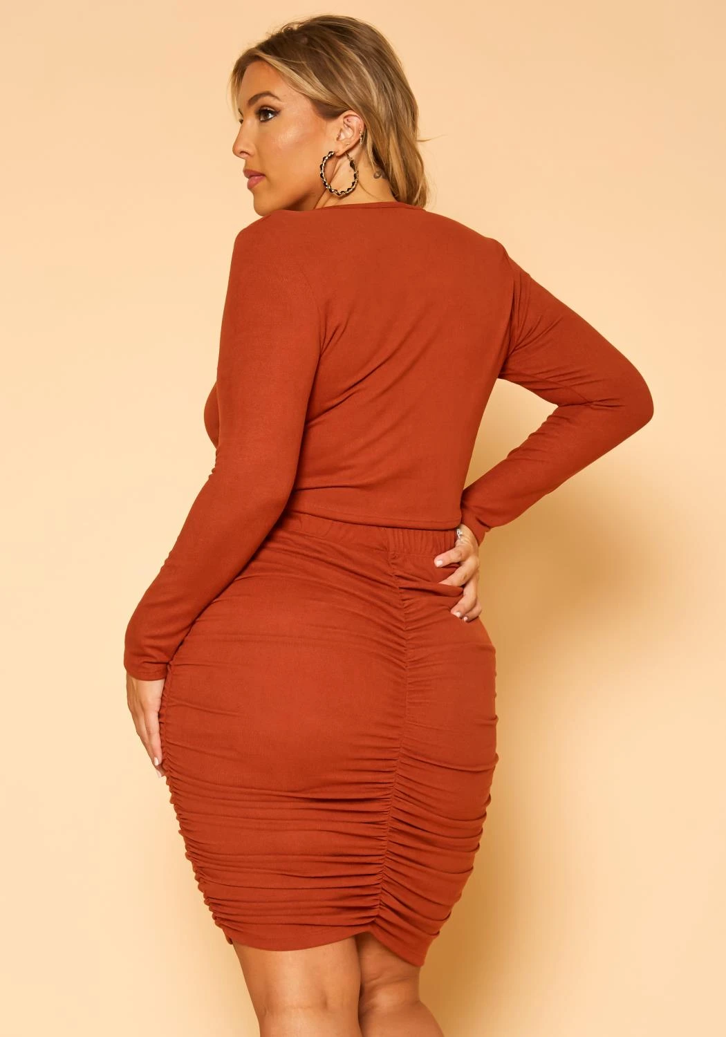 Favorite plus size women’s matching set with centered drawstring hem, v-neck style, long sleeve crop top and high waist bodycon mini skirt.
