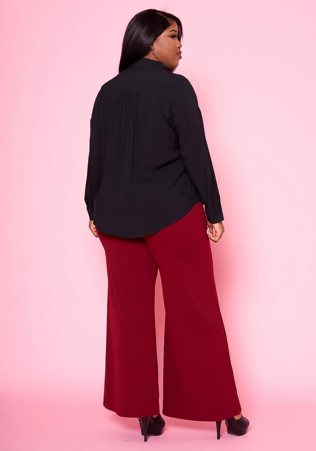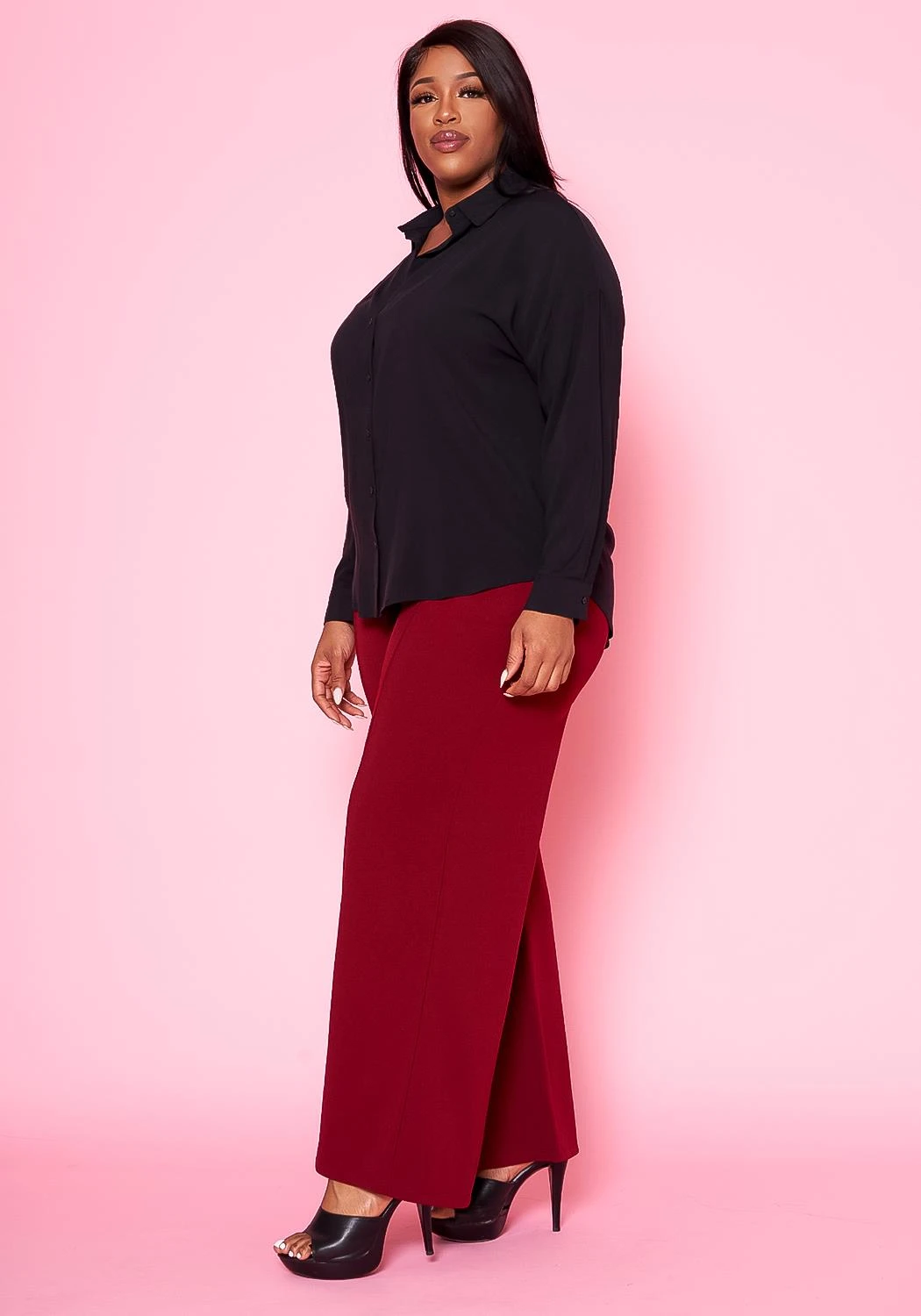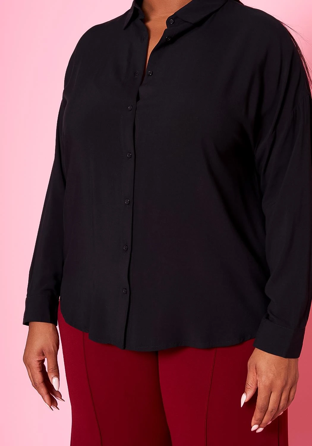 Essential plus size women’s collar shirt with button front closure and buttoned wist cuffs.
