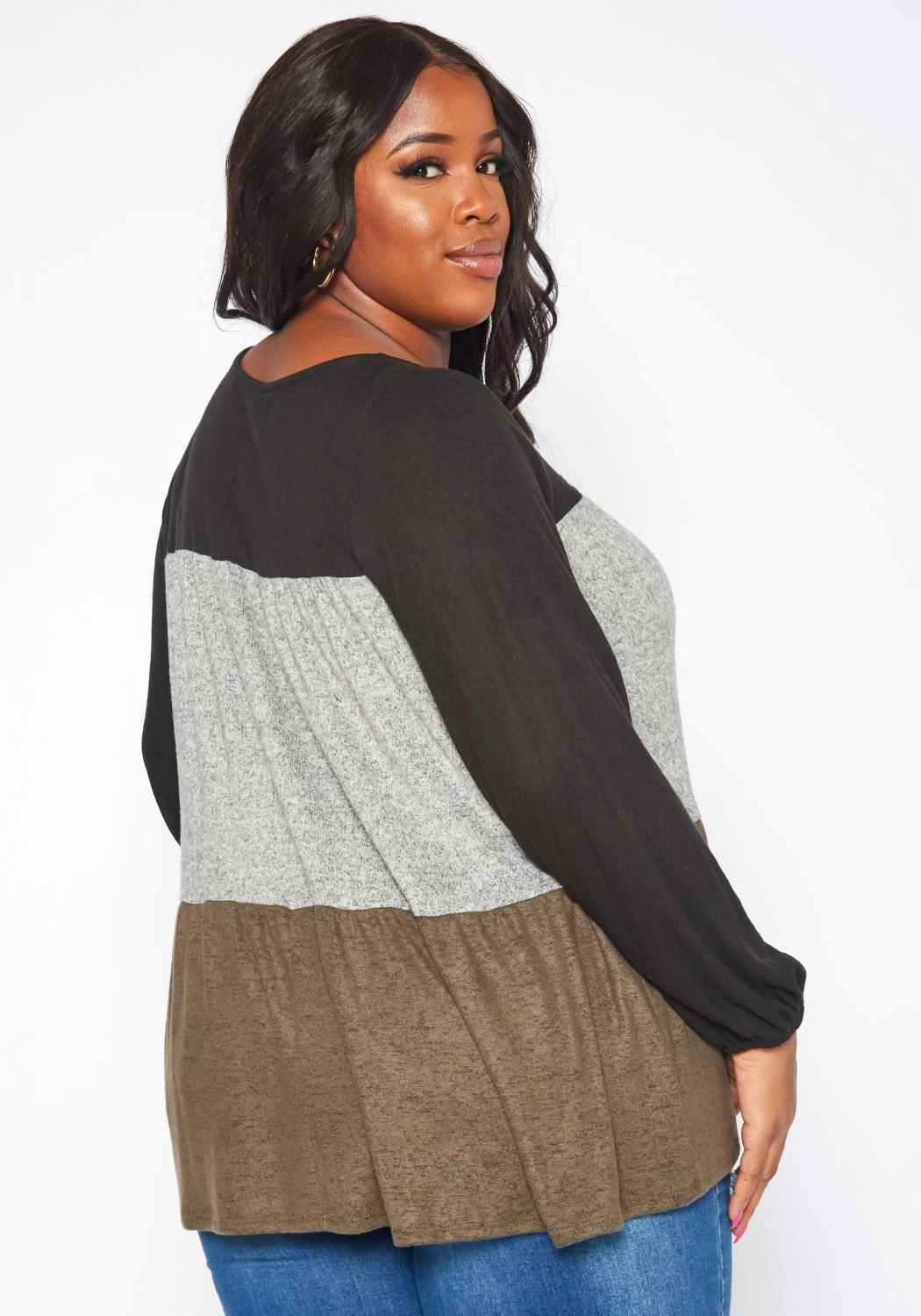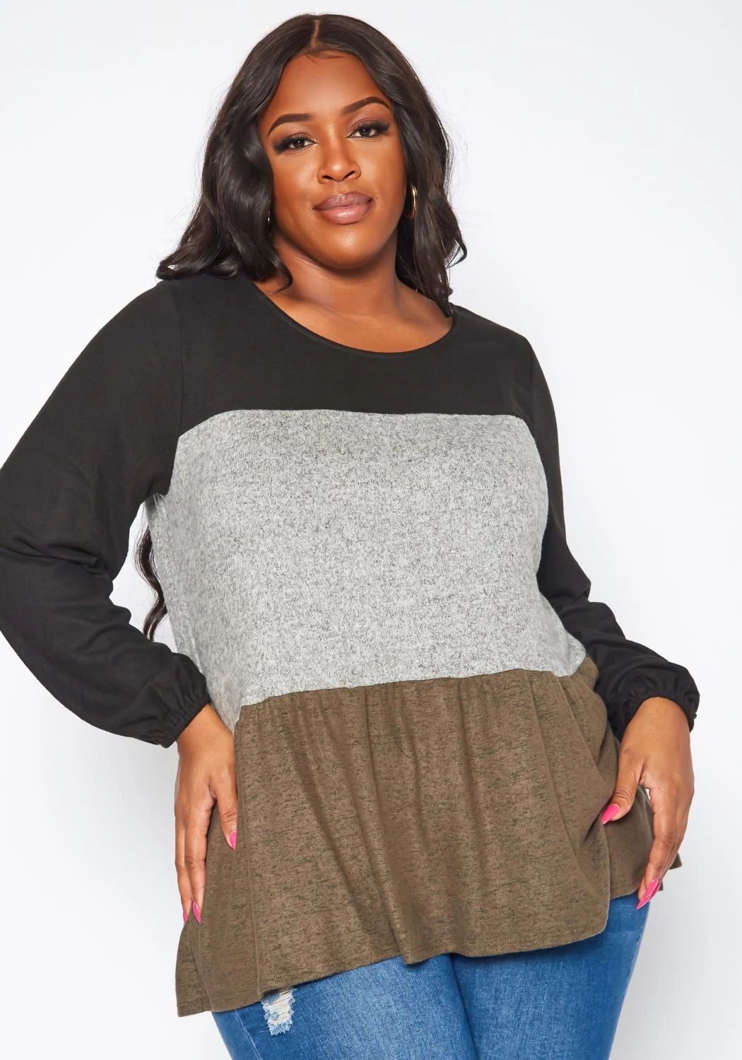 Casual plus size women’s knit shirt in color block design, relaxed fitting and crew neck style.