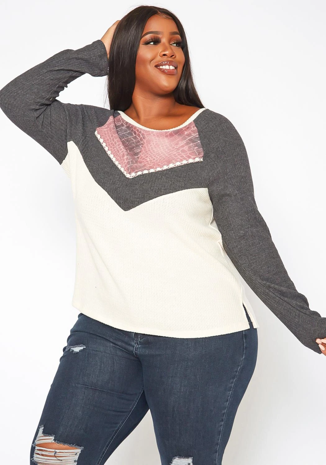 Plus size women’s casual knit top in color block design, snakeskin pattern, side slit hem and relaxed fitting.