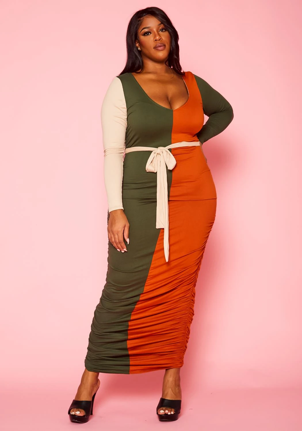 Plus Size Color Block Long Sleeve Maxi Dress