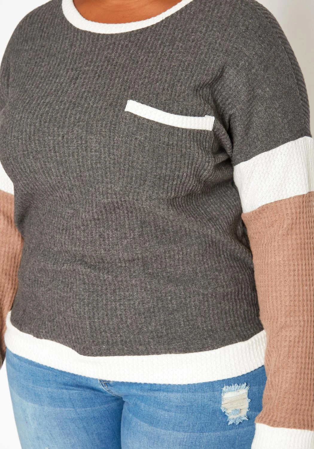 Casual must have color block sweater in color block style, crew neck fit, pocket hem and waffle knit material.
