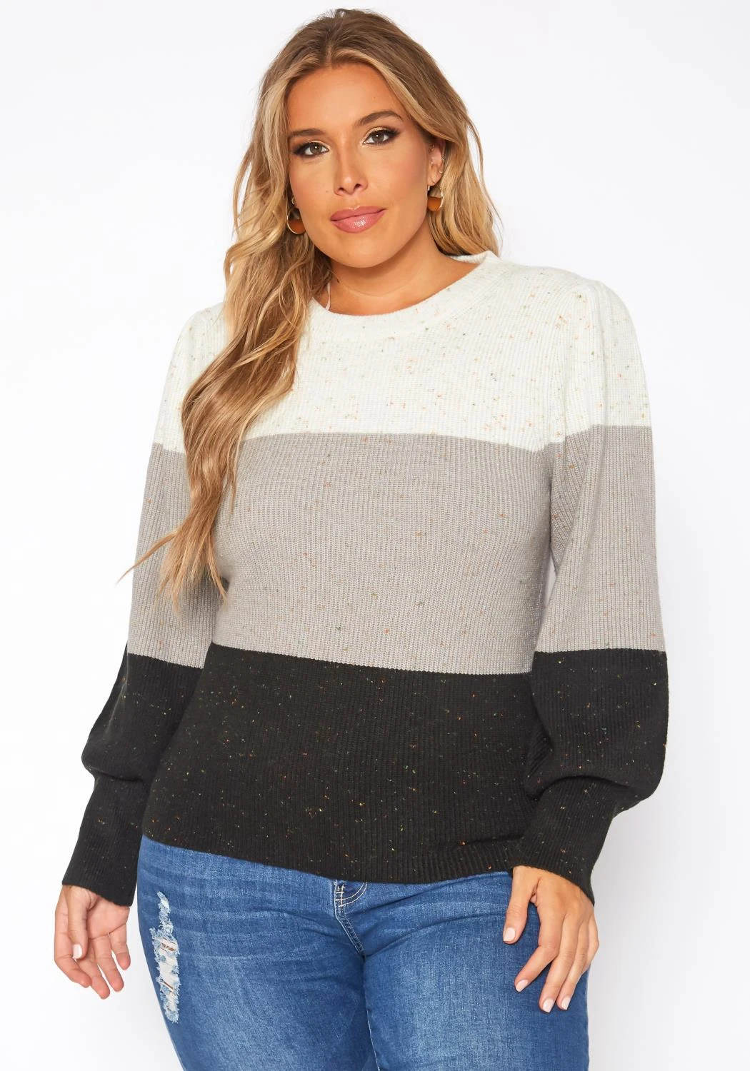 Cozy casual plus size women’s knit sweater in color block design, crew neck style and loose long sleeves with fitted wrist cuffs.