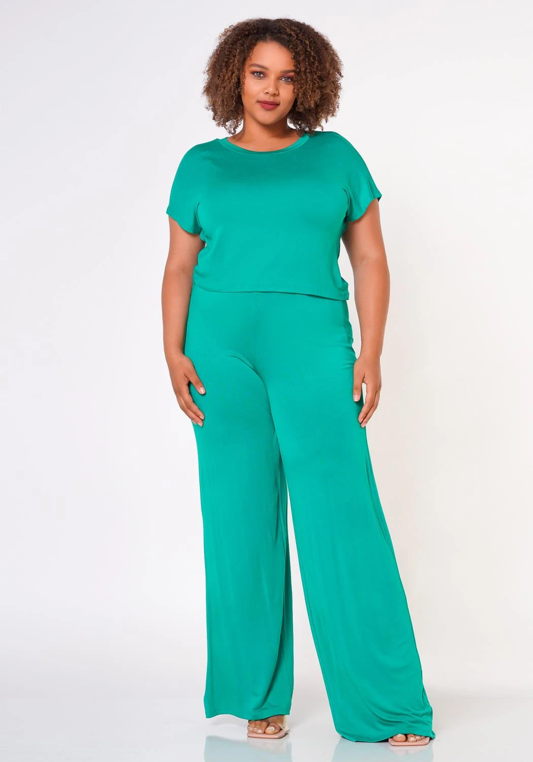 Effortless plus size women’s matching set which features a crew neck short sleeve t-shirt and high waist flare leg pants.