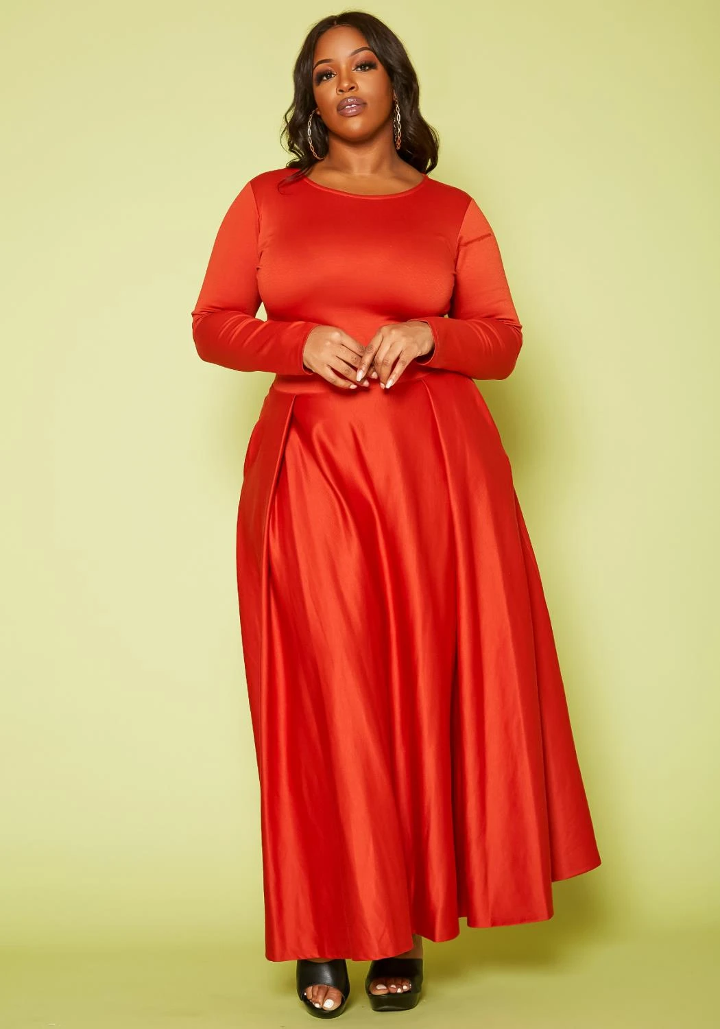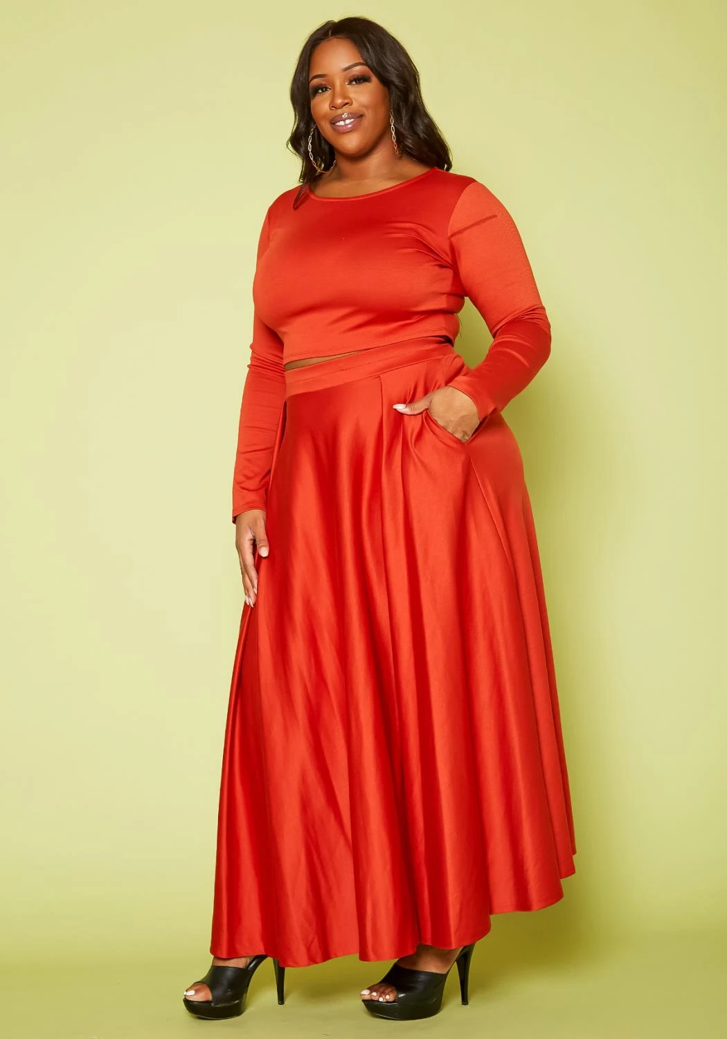 Plus size women’s two piece set which features a long sleeve, round neck style crop top and high waist style, pocket hem maxi flare skirt.