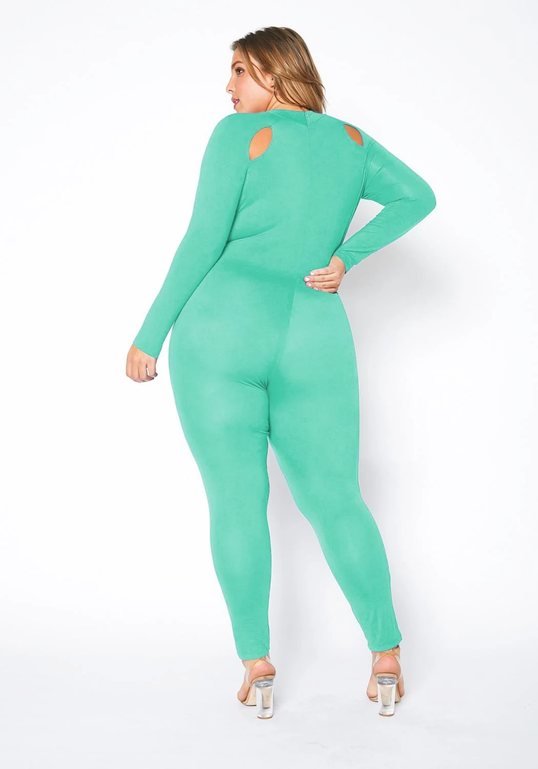 Flirty plus size women’s bodycon jumpsuit with cut-out design, fitted long sleeves, mock neck style and back zipper closure.