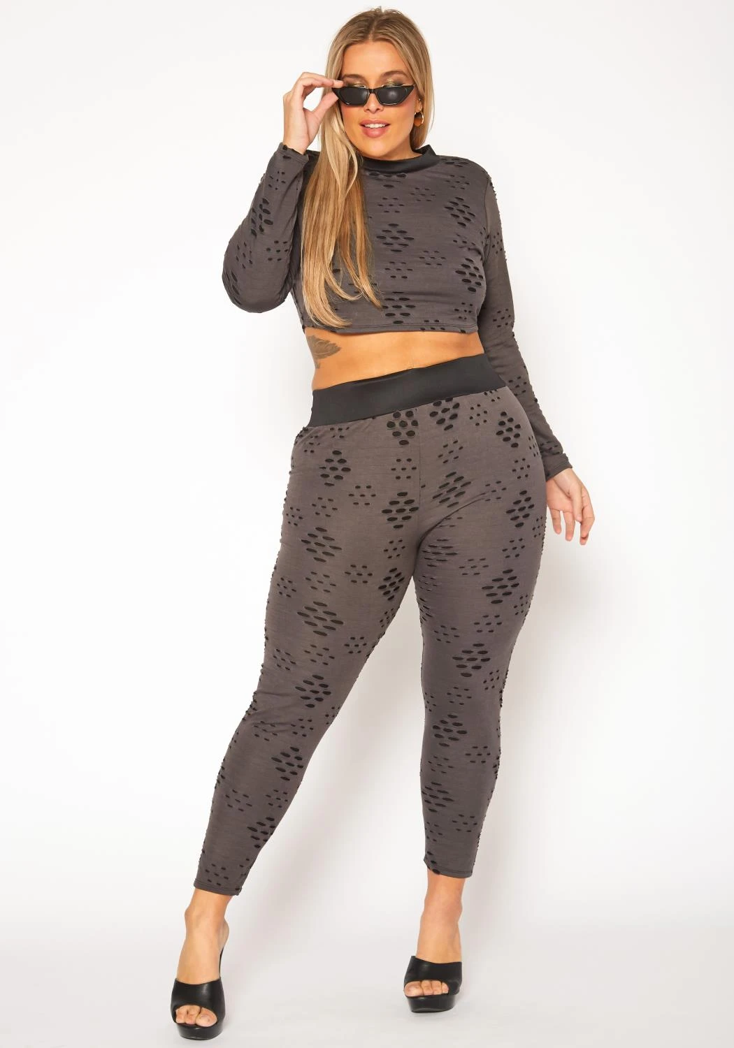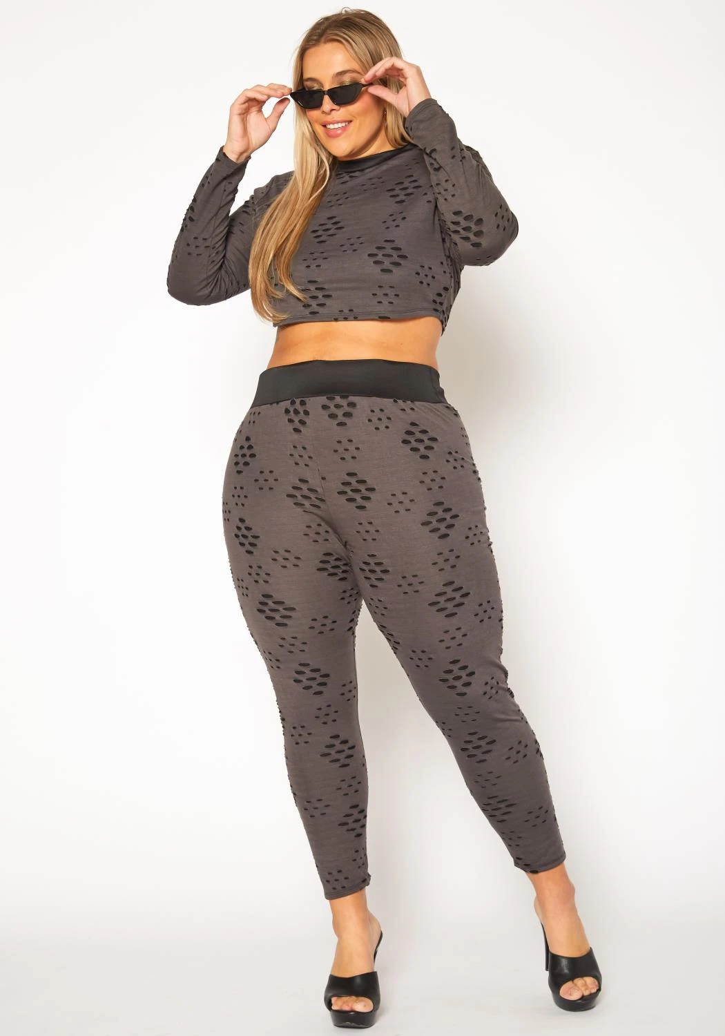 Edgy plus size women’s matching set which features a distressed detail long sleeve crop top and high waist band leggings.
