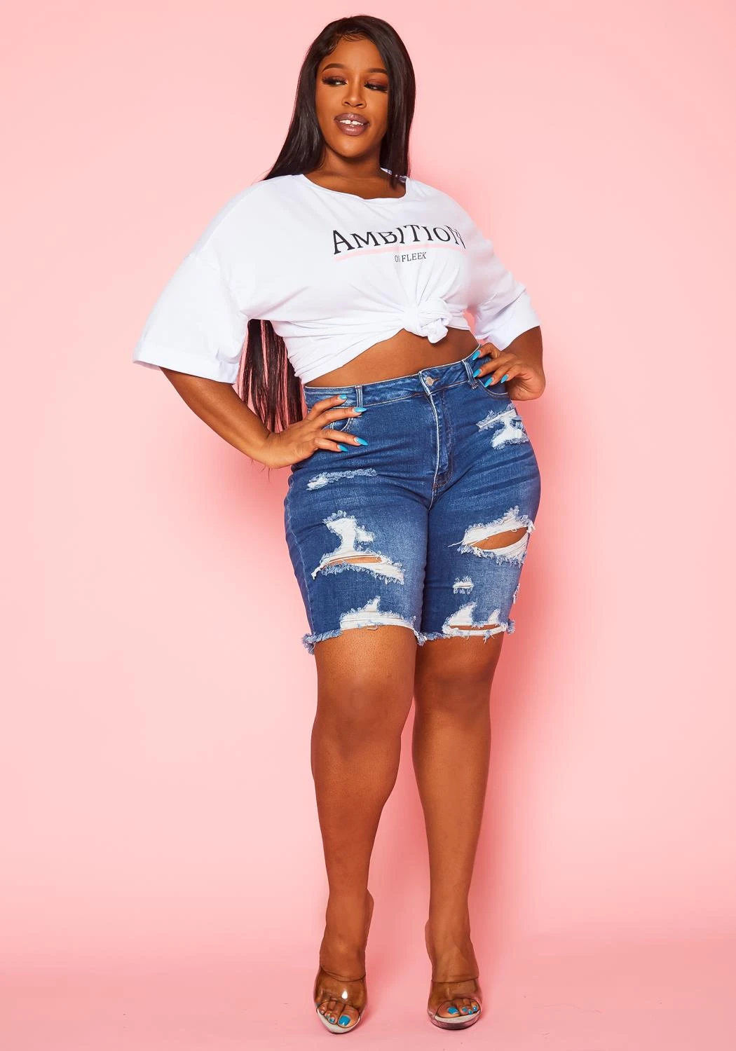 Plus size women’s shorts in denim style, featuring distressed detail, front and back pockets & zipper/button closure.