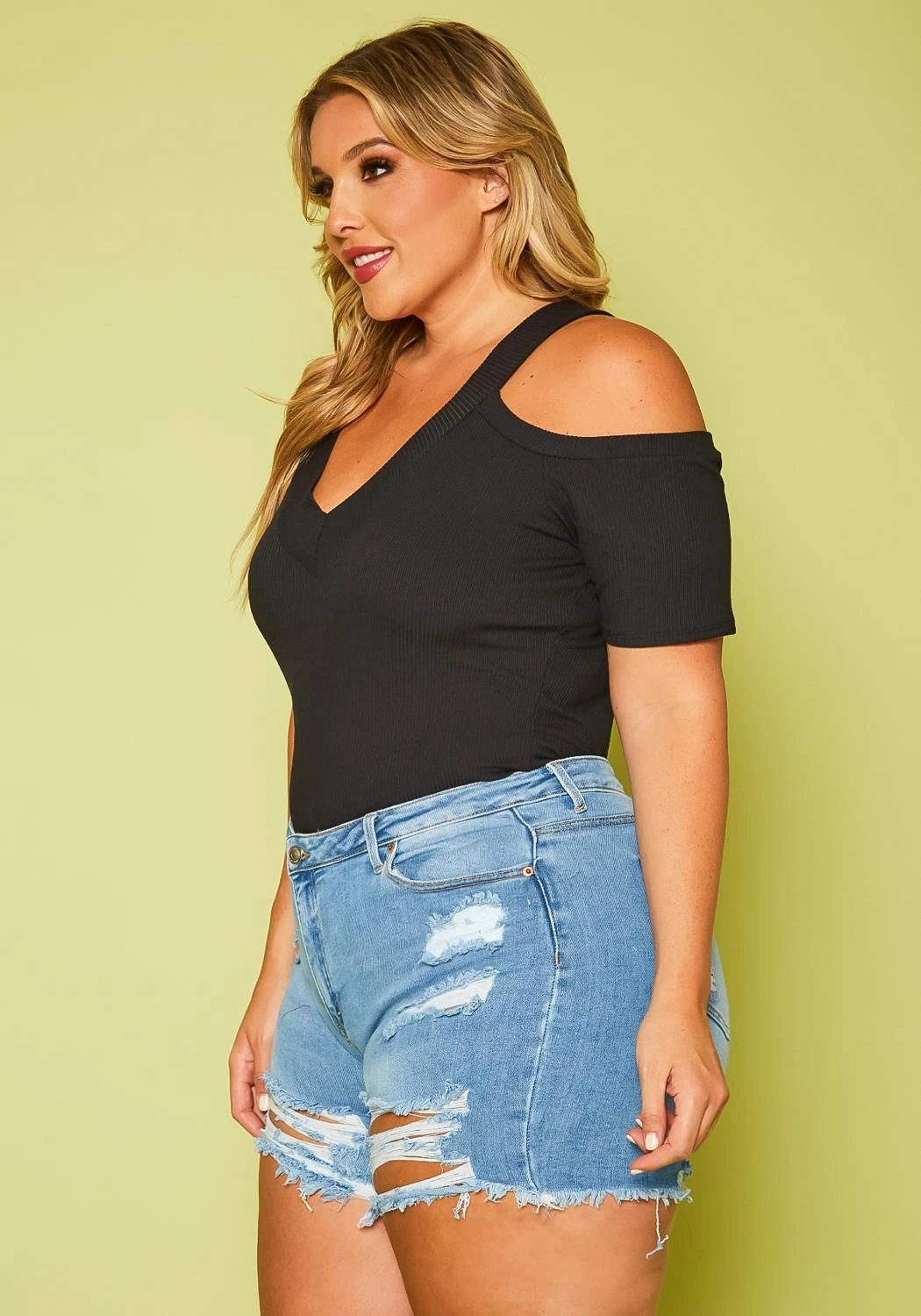 Plus size women’s shorts in denim style, featuring distressed detail, front and back pockets & zipper/button closure.