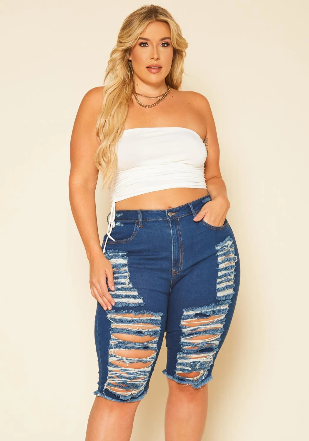 Summer fav biker denim shorts for plus size women which feature a high waist style, distressed front/back hem, belt loop holes and pockets.