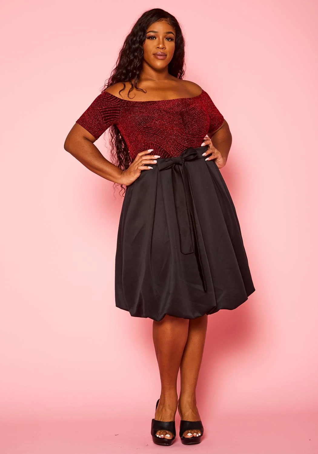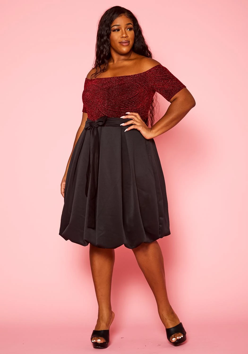 Gorgeous plus size women’s fit to flare mini dress with embellished design, off shoulder style, short sleeves, waist tie hem and puffy bottom flare.