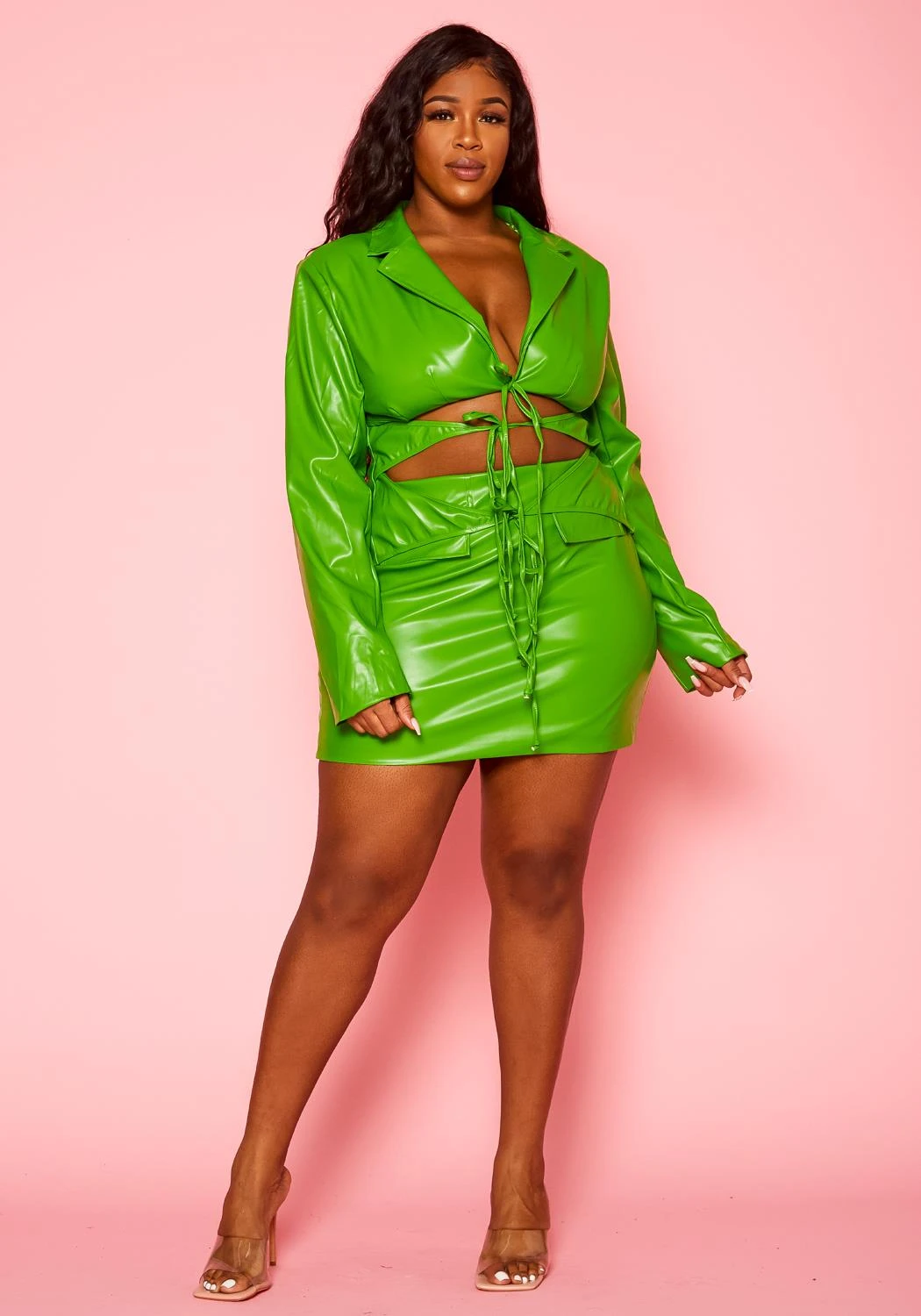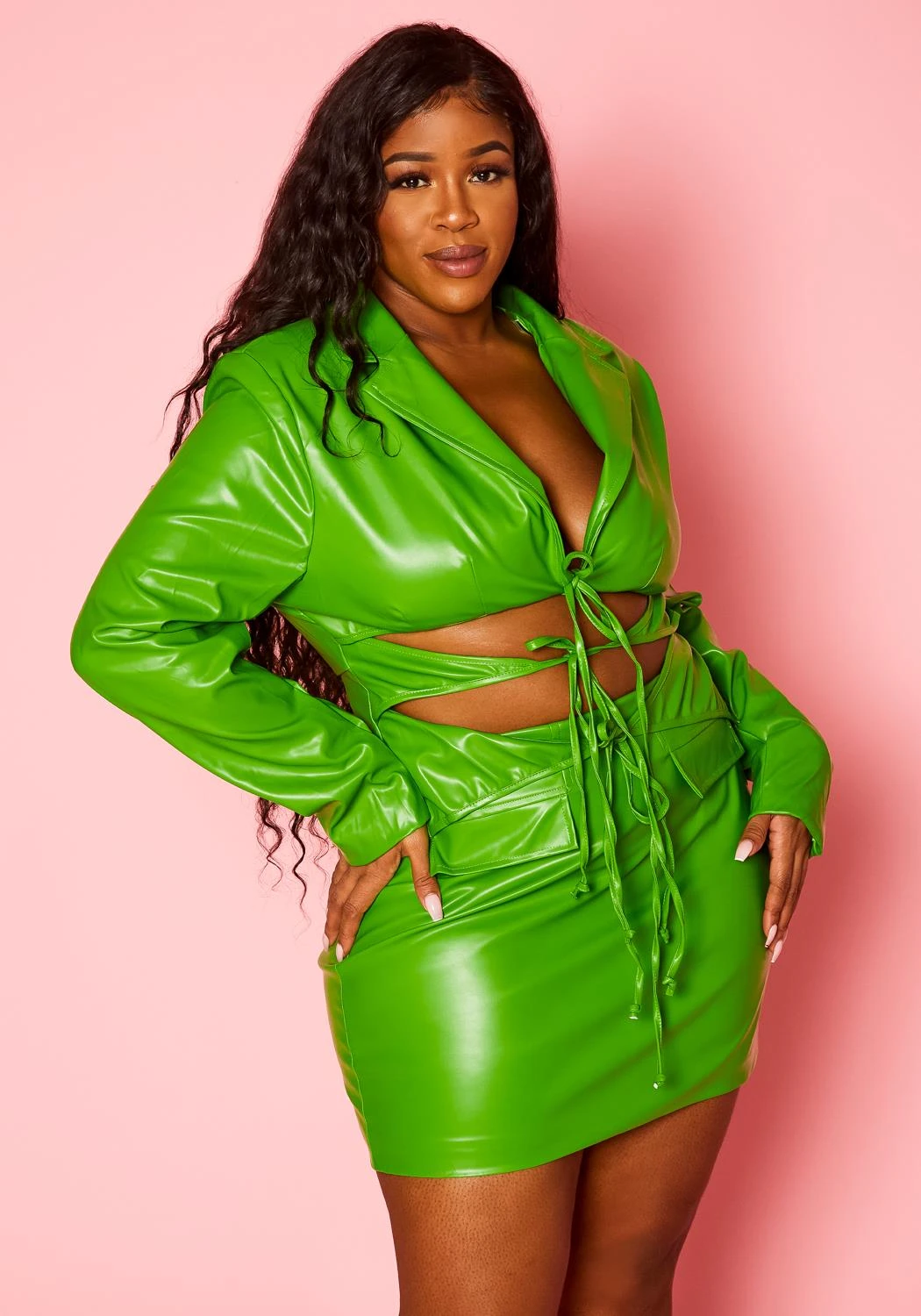 Stunning plus size women’s faux leather dress with front cut-out design, collar neck style, tie front details and faux pocket hem.