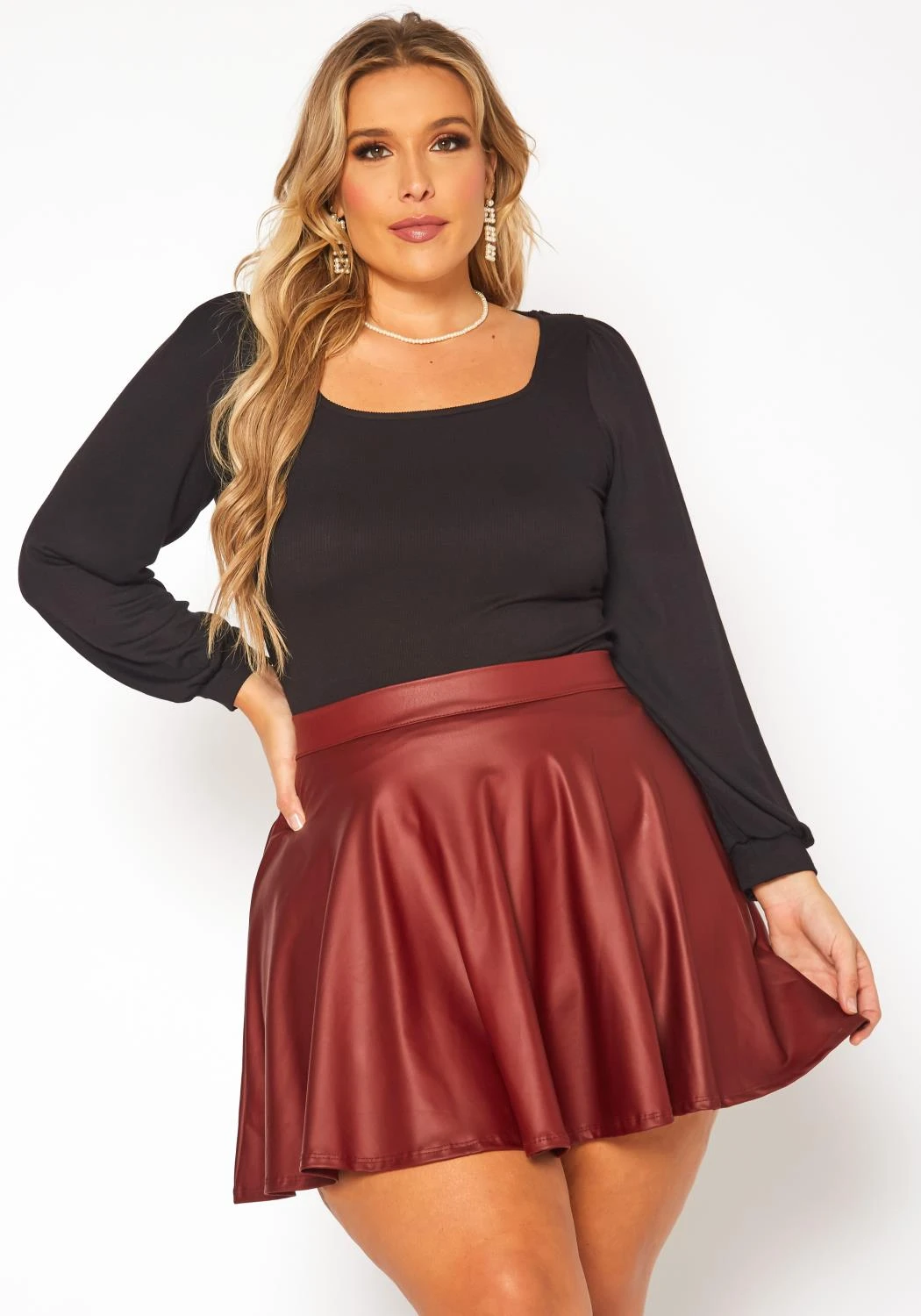 Edgy meets chic in Asoph’s matte faux leather high waist mini circle skirt! A must have plus size women’s skirt that shows off a cute and stylish appeal. Contains back mid zipper closure.