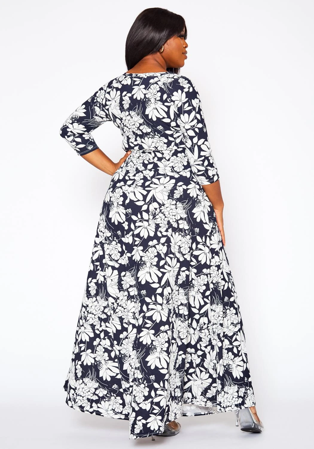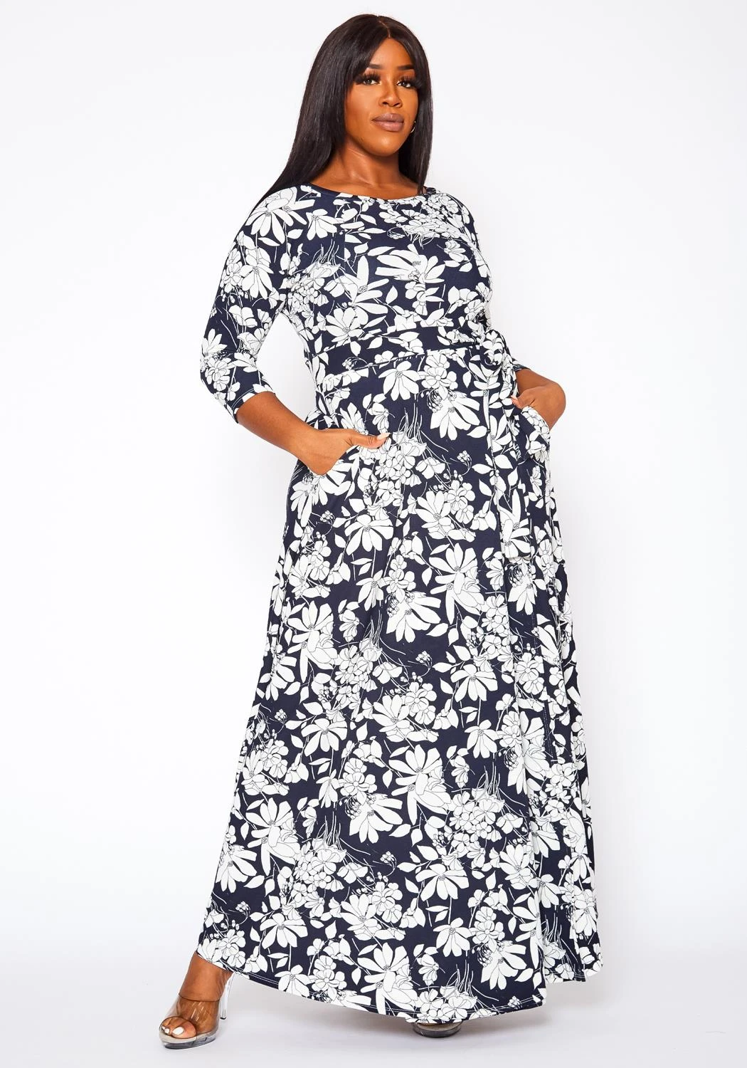 Plus size women’s dress in maxi style, featuring a front wrap hem, round neck hem, 3/4 sleeves, side pockets & waist detachable tie-up belt detail.