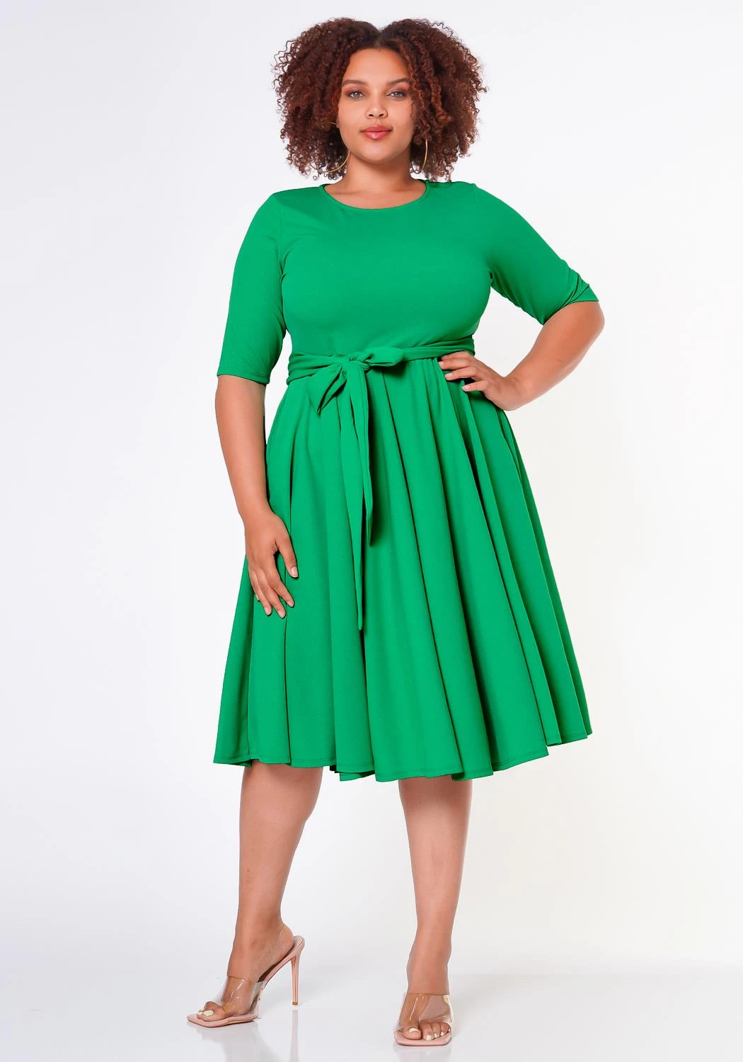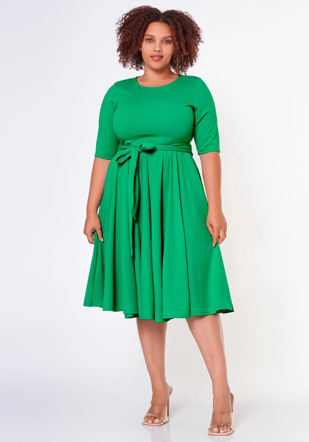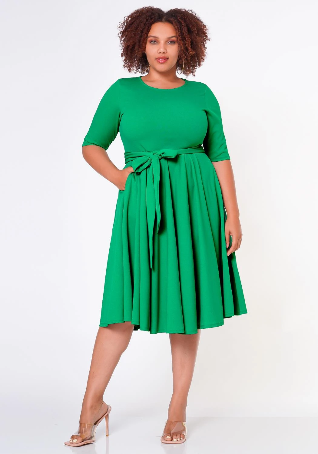 Plus size women’s dress in fit & flare style featuring a round neck hem, attached waist tie ascent, elbow sleeves and side pockets.