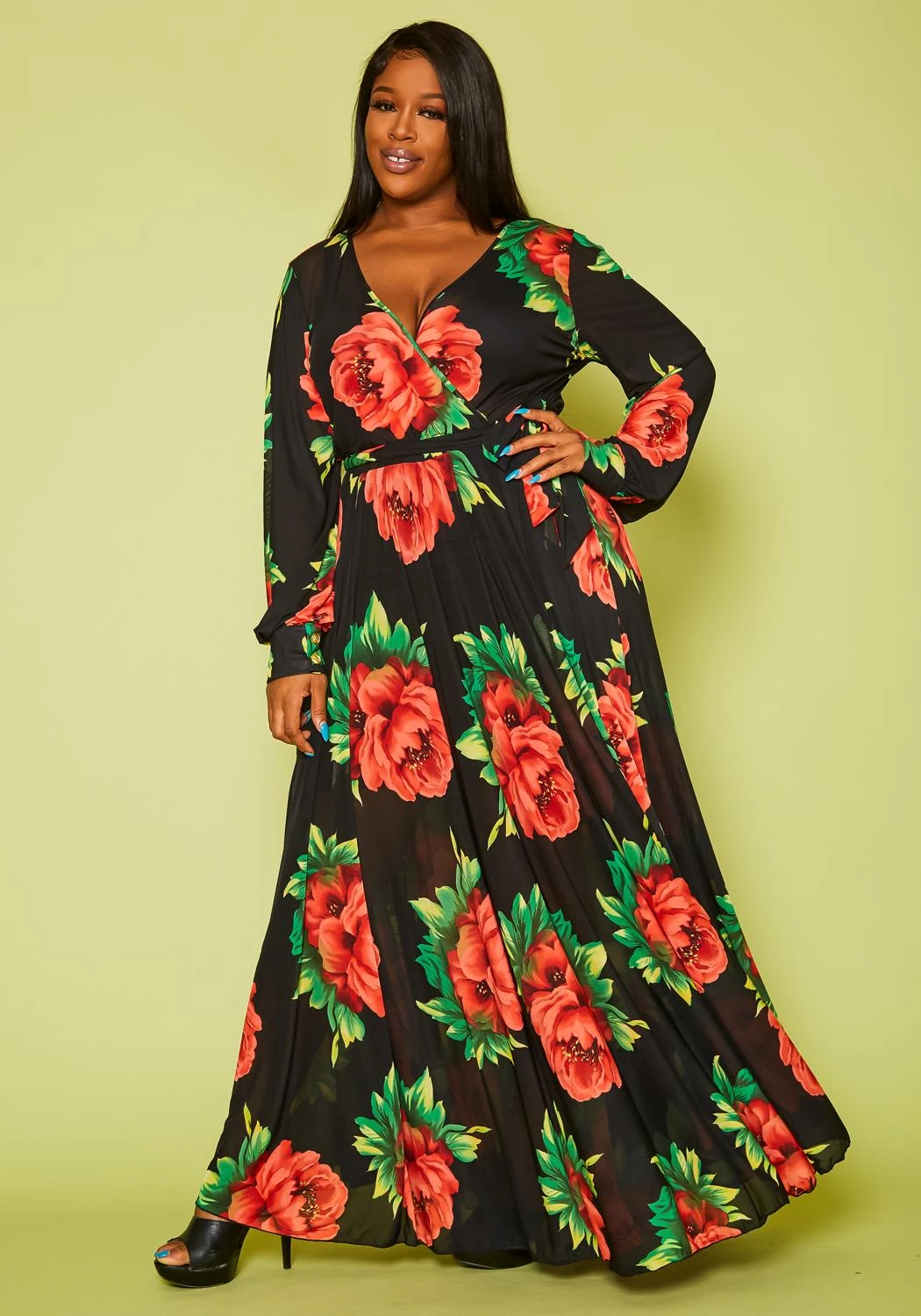 Plus size women’s dress in fit & flare style, featuring a front v-neck, long sleeve cuff hem with button details and waist tie ascent.