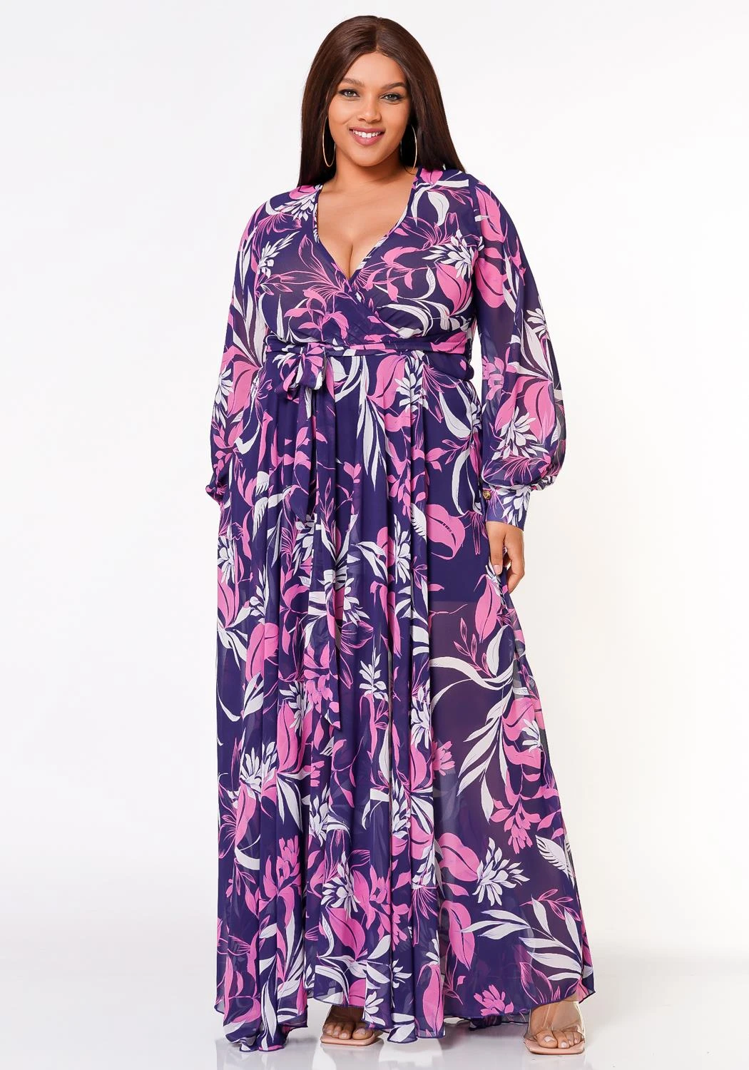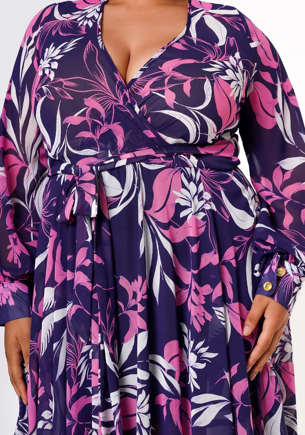 Absolute gorgeous plus size women’s maxi dress in multi pattern, v-neck style, long sleeves, fitted wrist cuffs and waist tie ascent.