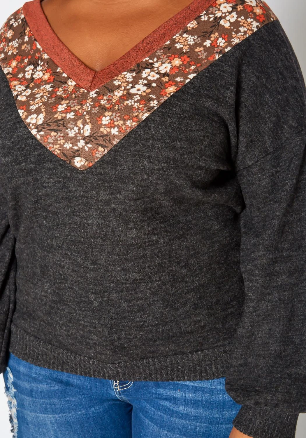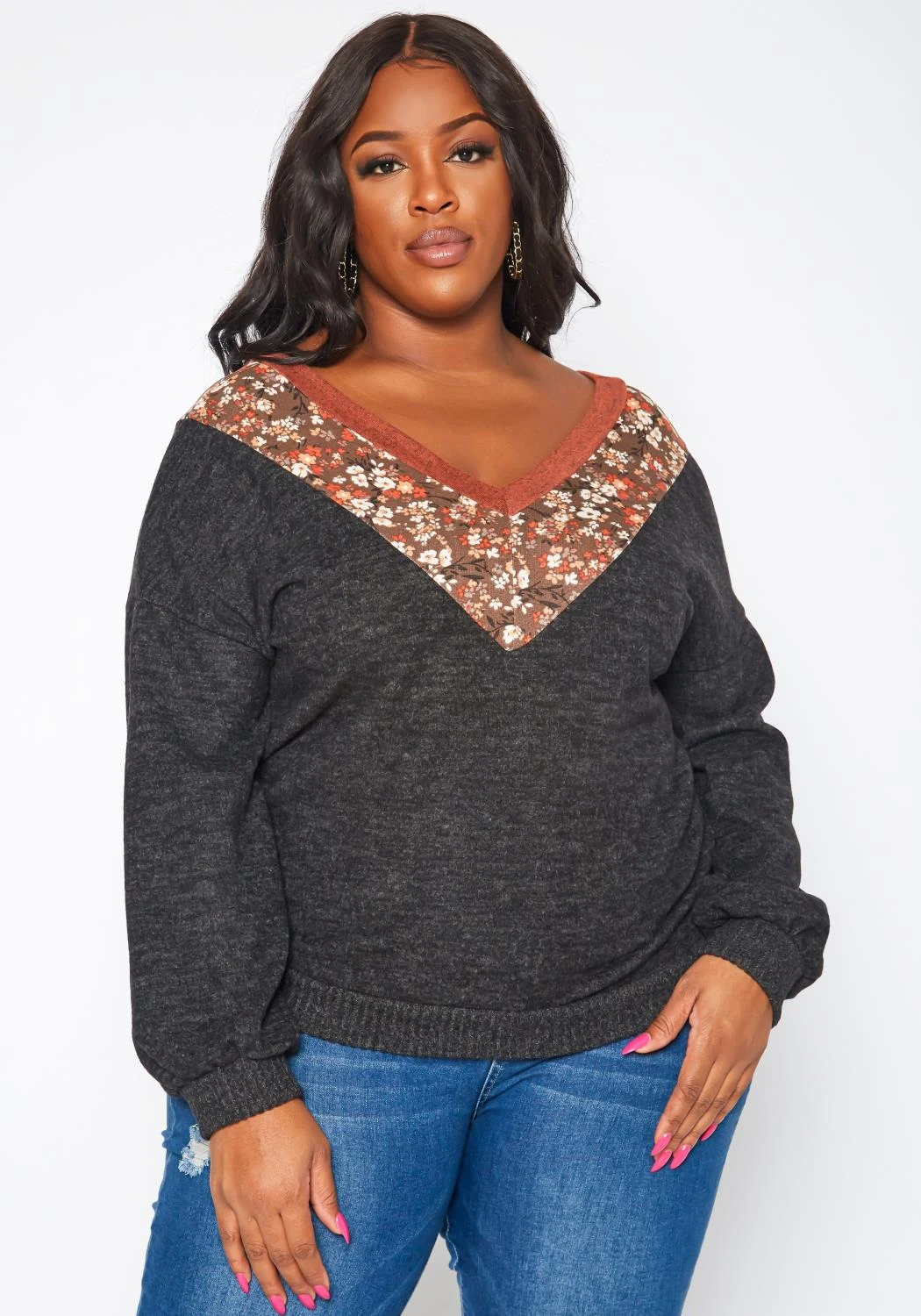 Casual plus size women’s top in floral print, color splice, long sleeves, fitted wrist cuffs and knit material.