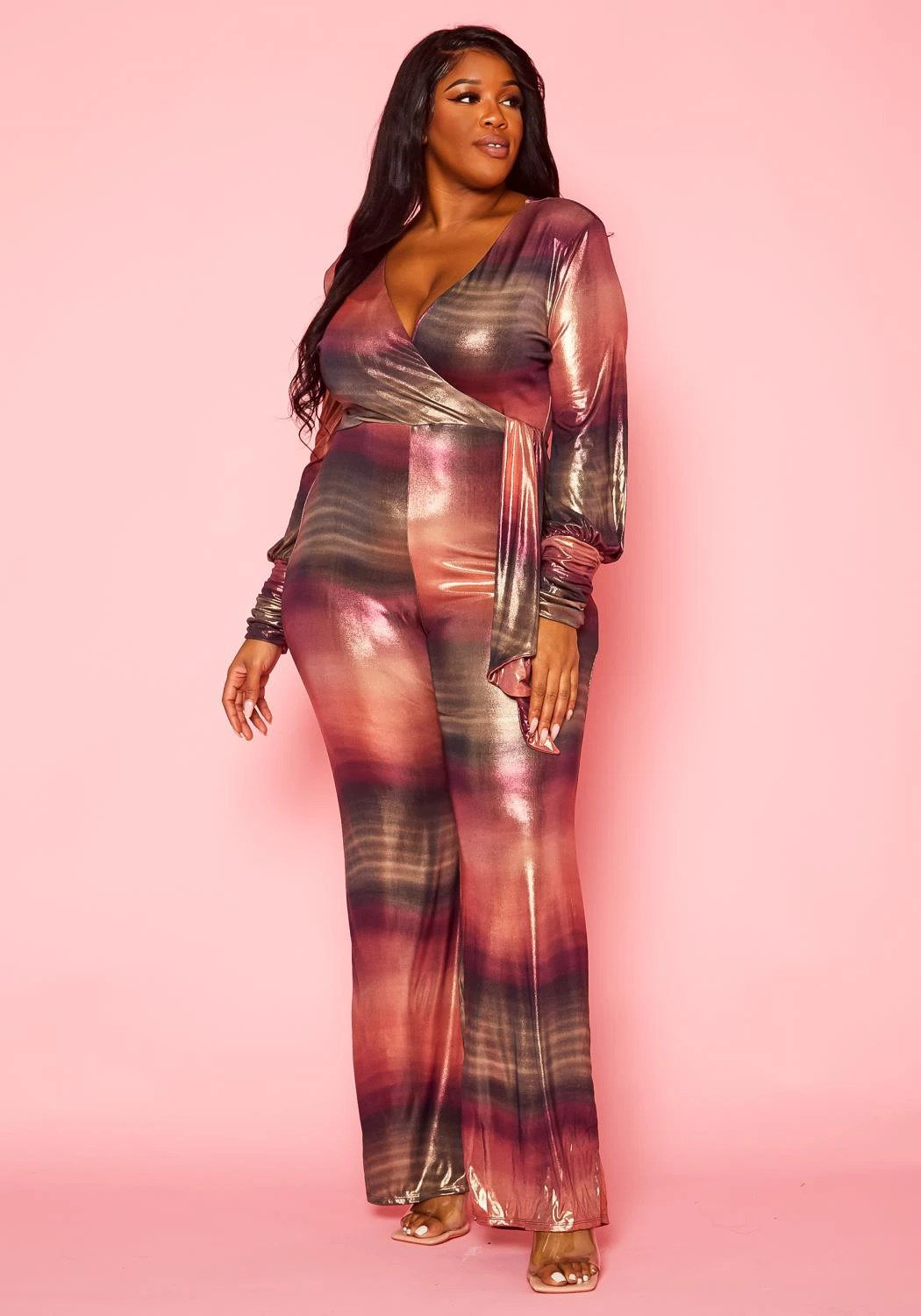 Romantic plus size women’s jumpsuit in gradient color pattern, sheen-metallic material, v-neckline, flare leg hem and long sleeves with fitted wrist cuffs.