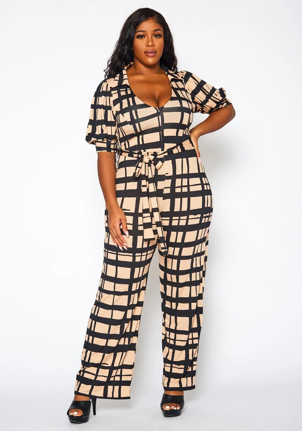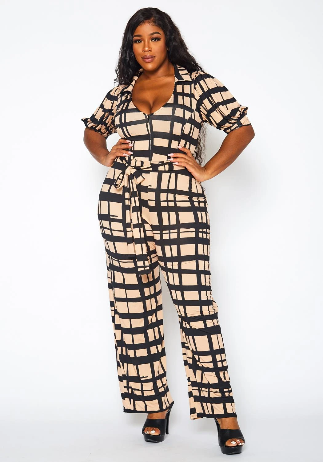 Chic plus size women’s jumpsuit in gridline plaid pattern, v-neck style, short puffy sleeves, waist tie ascent and flare leg hem.
