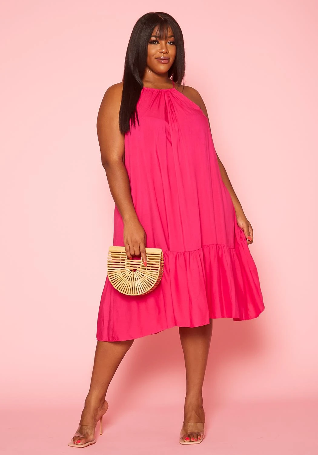 Plus size women’s dress in halter style, featuring tiered hem, side pockets & drawstring tie up closure.