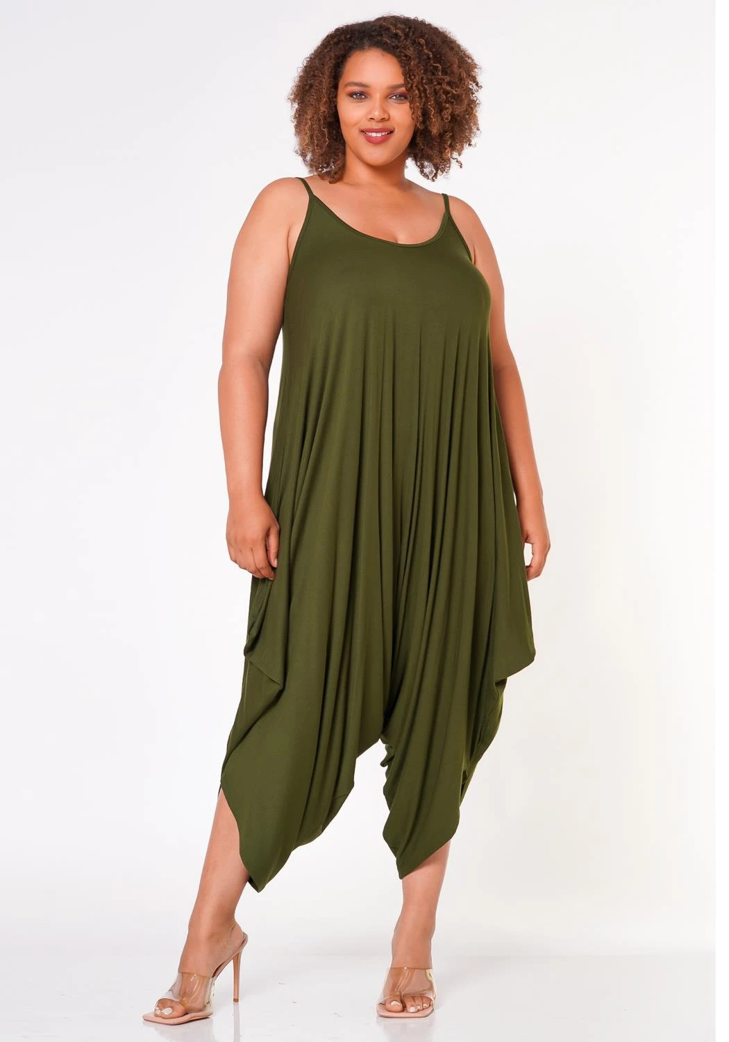 Lounge essential cami jumpsuit for plus size women in harem design, cami shoulder straps, U-neckline, capri length and relaxed fitting.