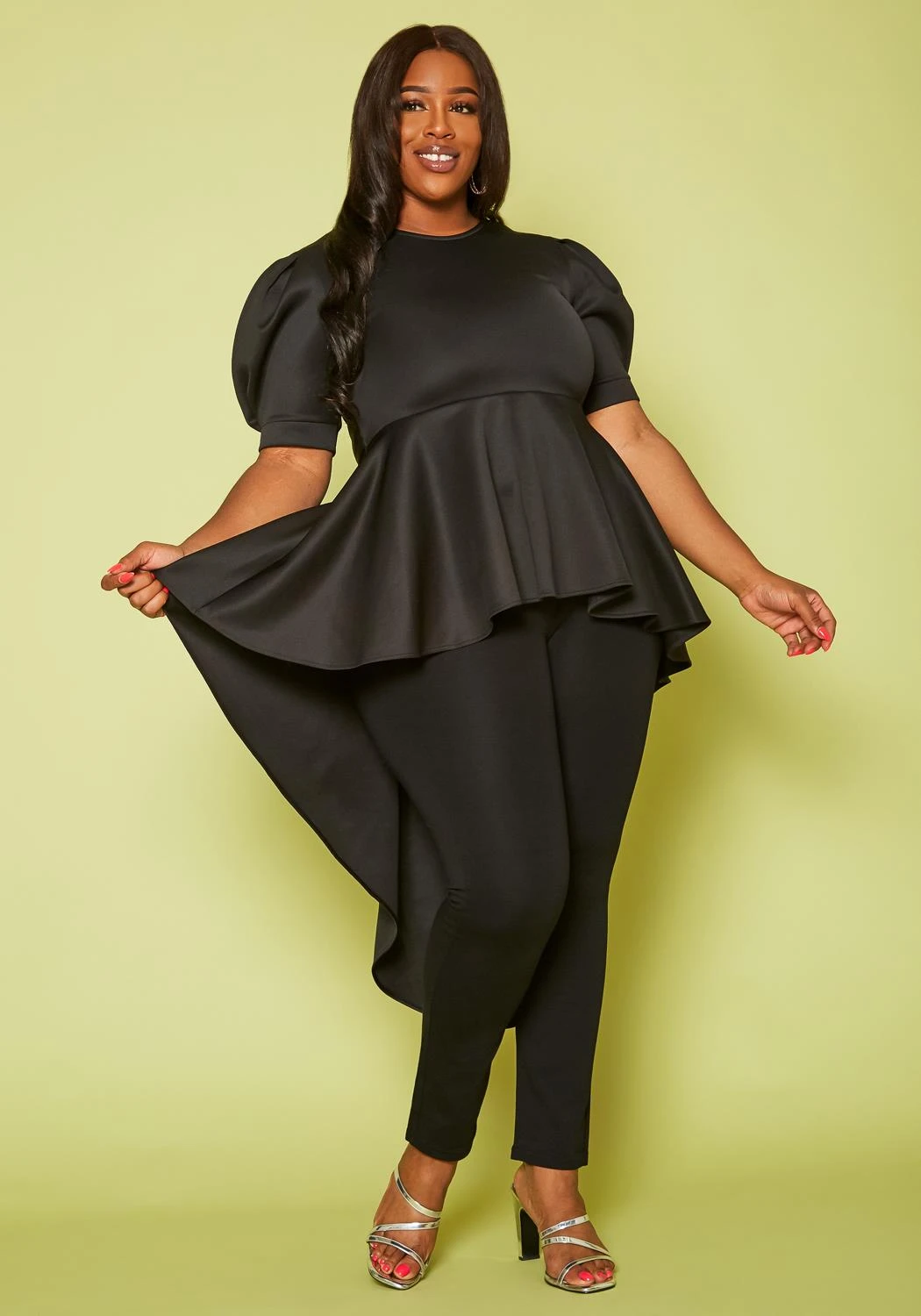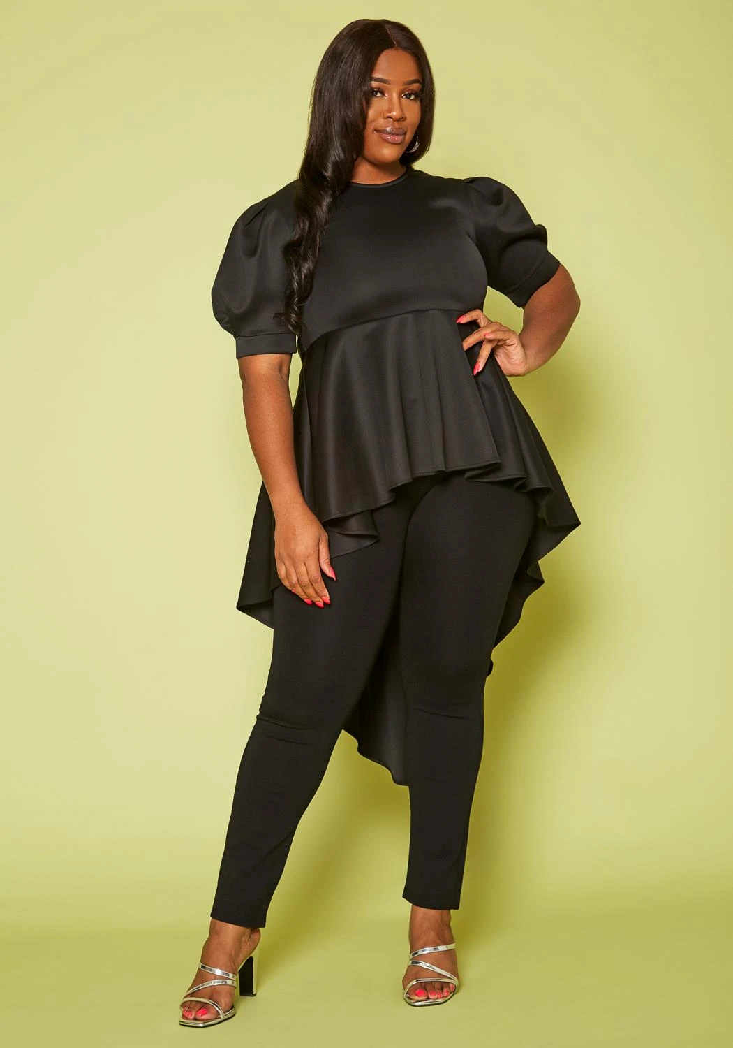 Plus size women’s top in high-low style, featuring peplum detail, elbow puff sleeves with a versatile waist tie up ascent.
