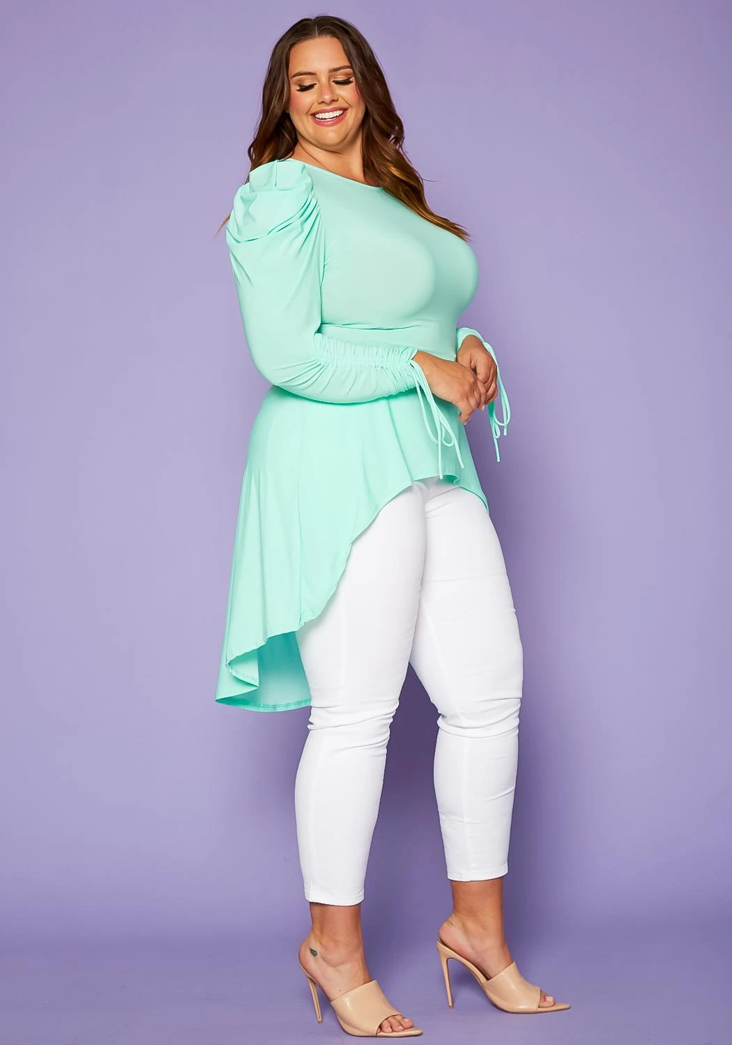 Plus size women’s top in high-low style featuring a round neck hem, puffed shoulders, ruched sleeves with drawstring detail.