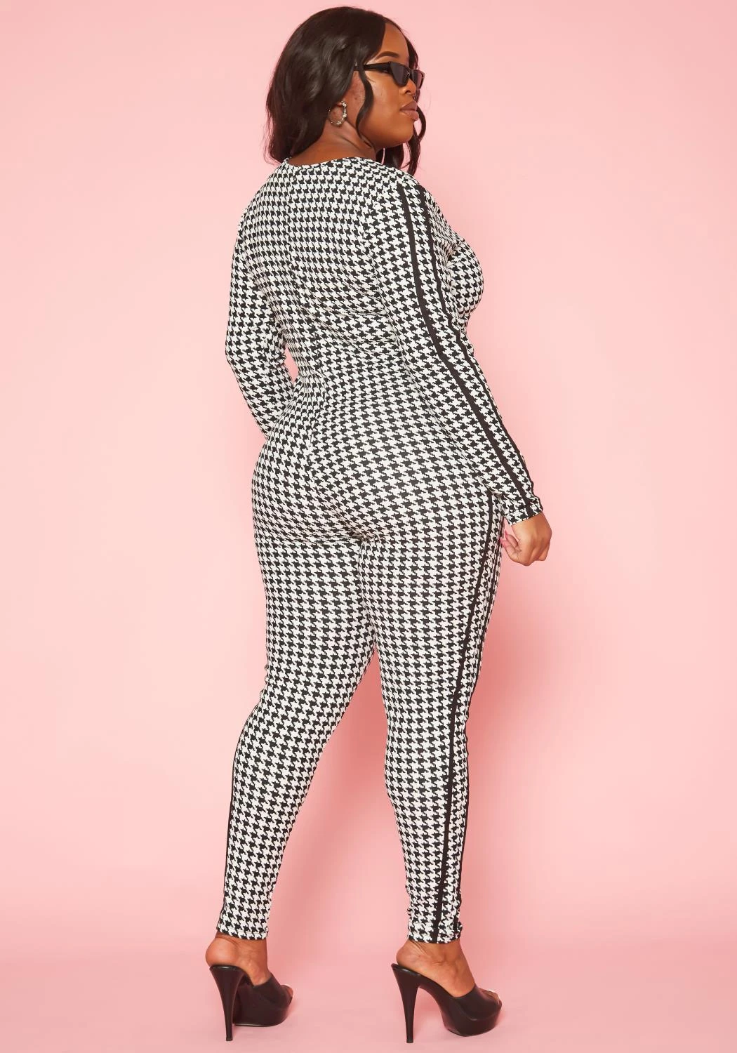 Stunning plus size women’s jumpsuit in houndstooth plaid pattern, v-neck style, long sleeves, bodycon fitting and back zipper closure.