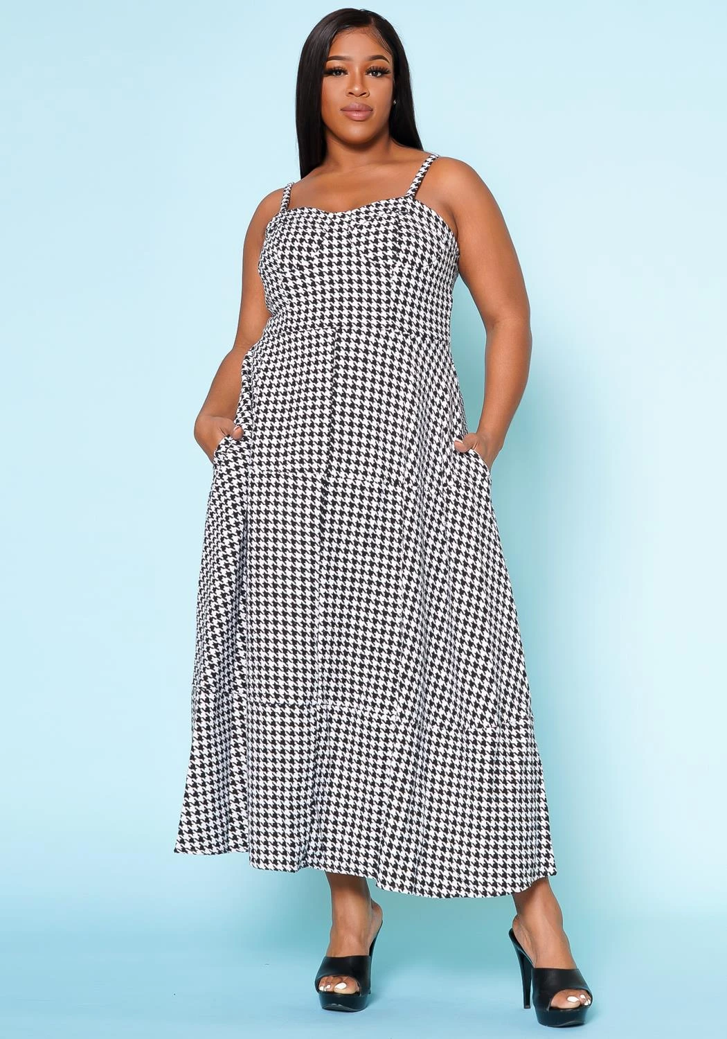 Plus size women’s maxi dress in houndstooth pattern, cami shoulder straps, sweetheart neckline and back zipper closure.