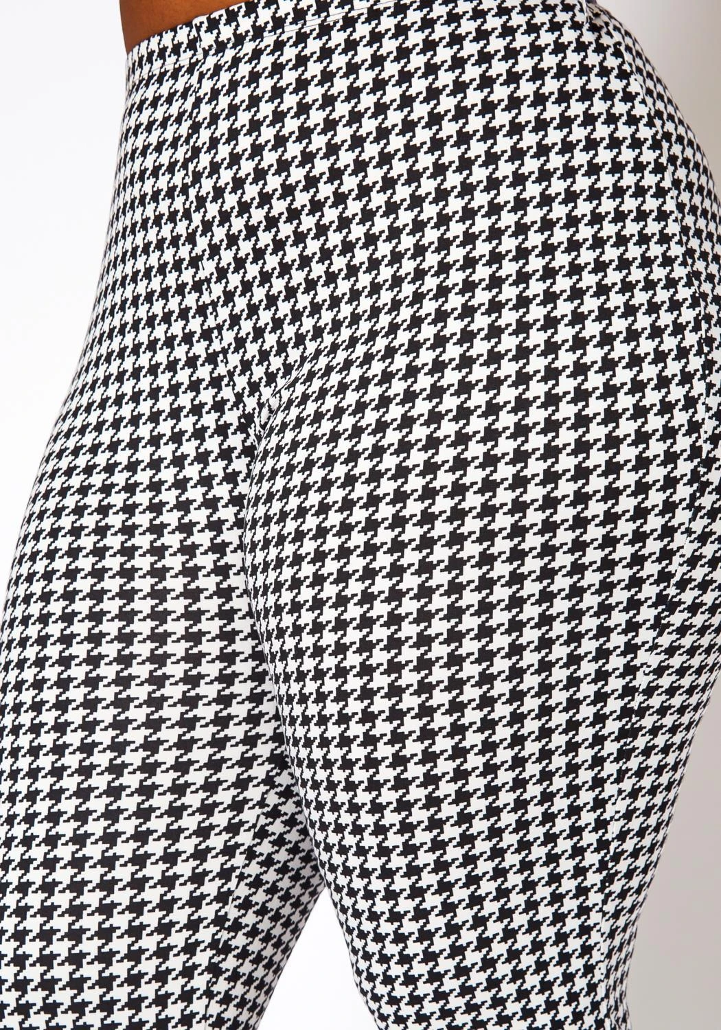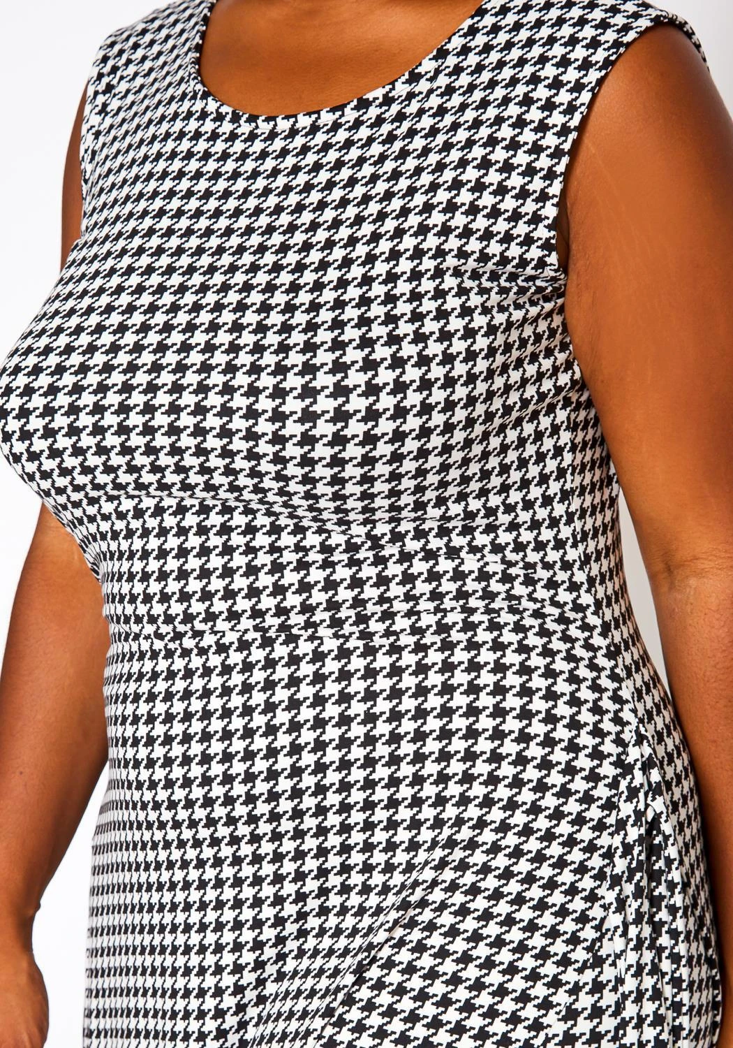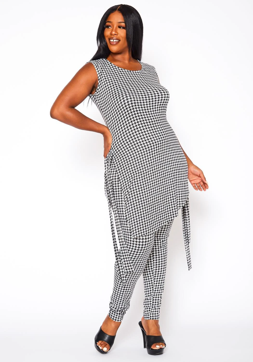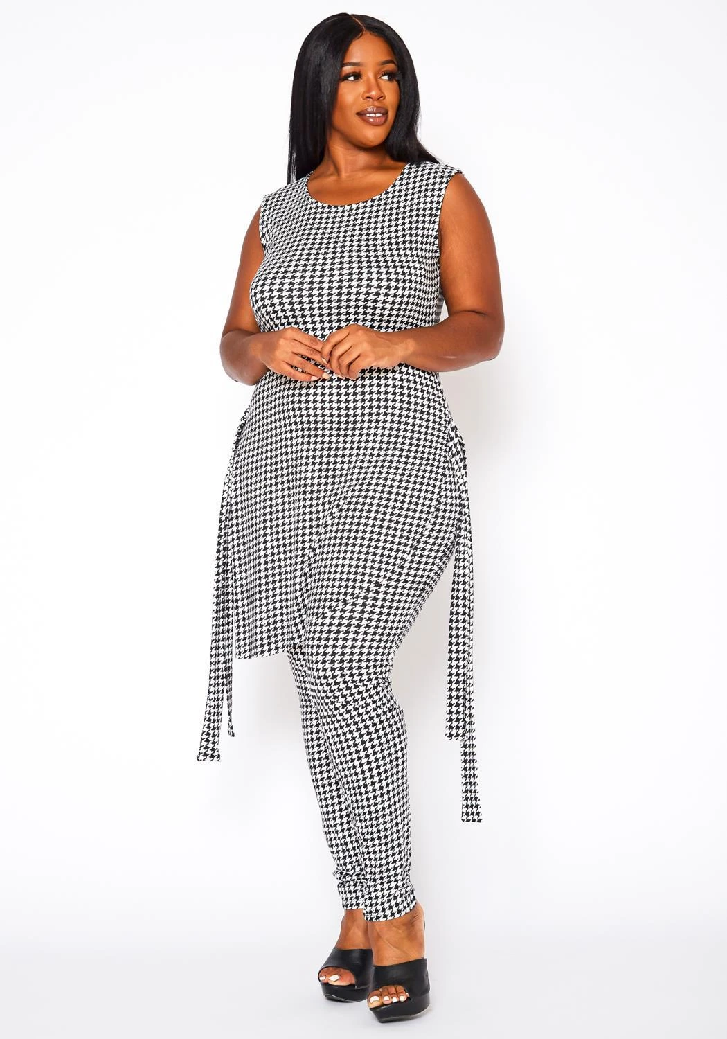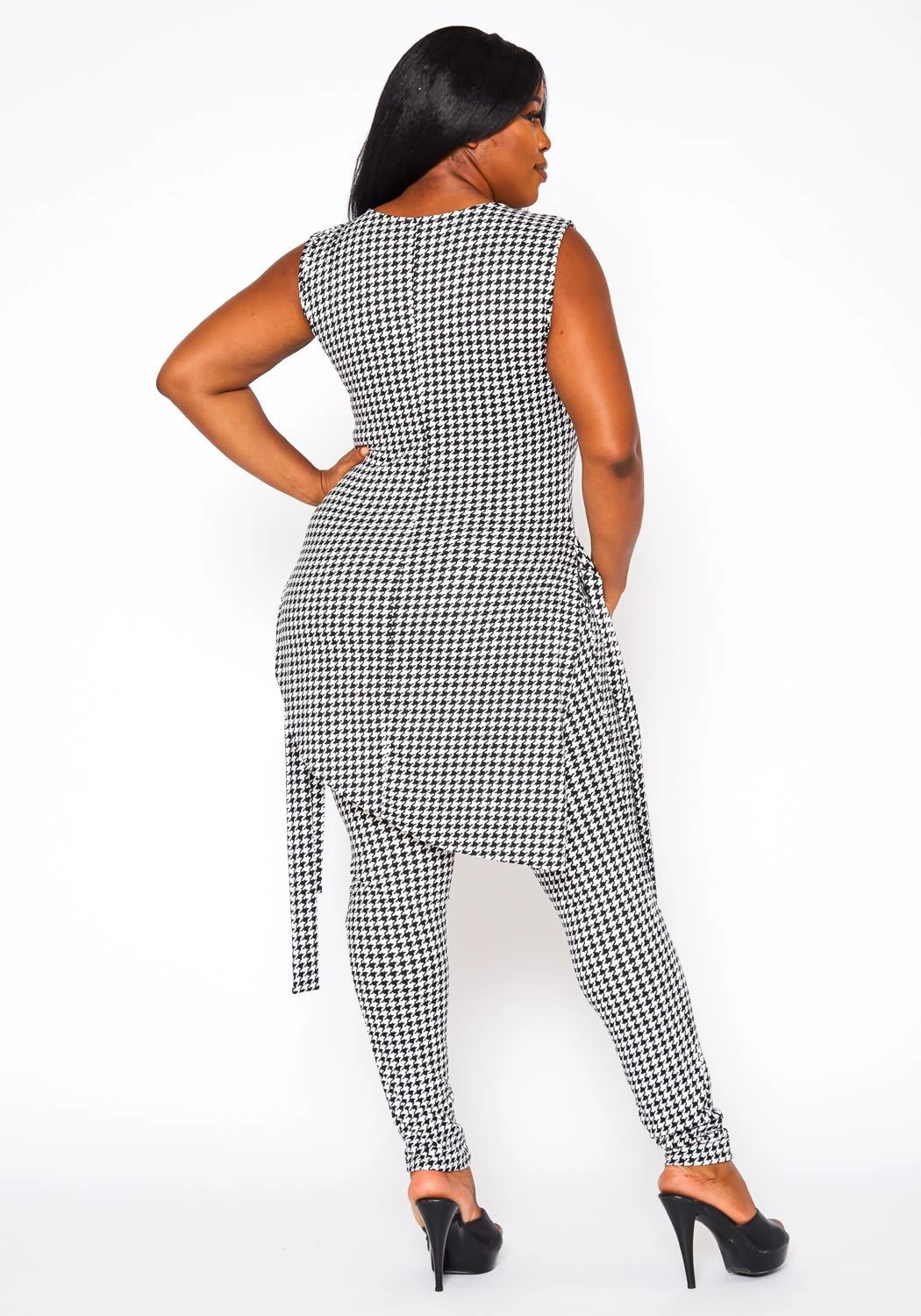 Plus size women’s set featuring an asymmetrical top with waist tie, houndstooth print, sleeveless style, round neckline and nicely paired with high waist leggings. Print is brocade pattern to elevate the look.