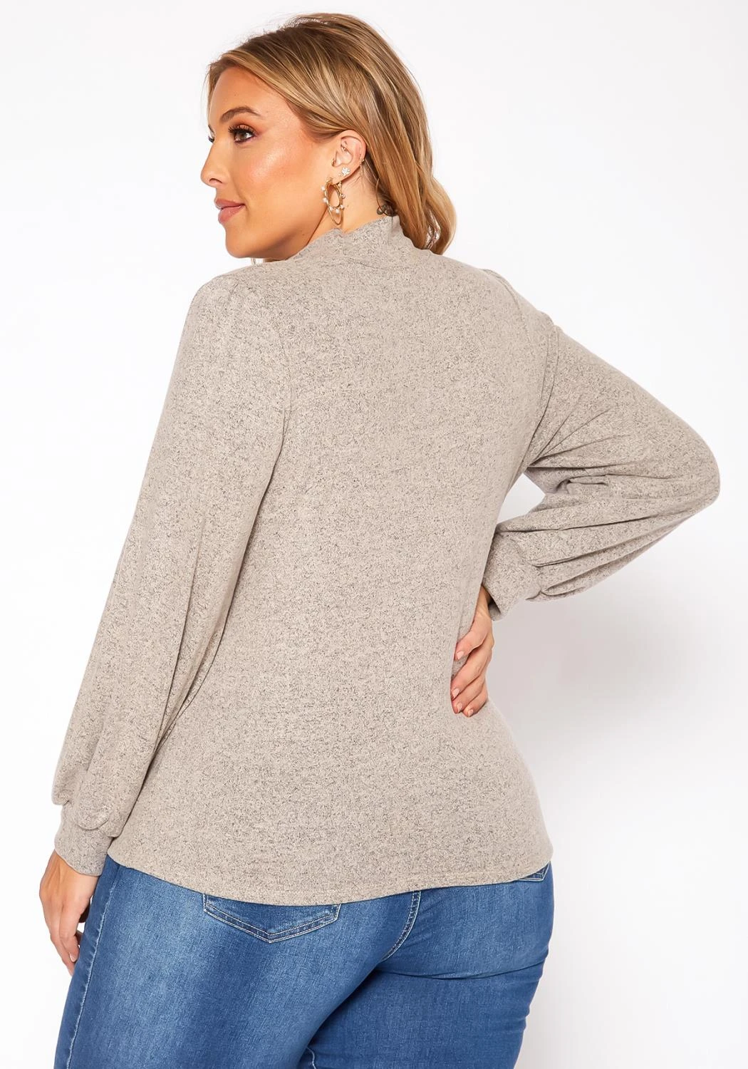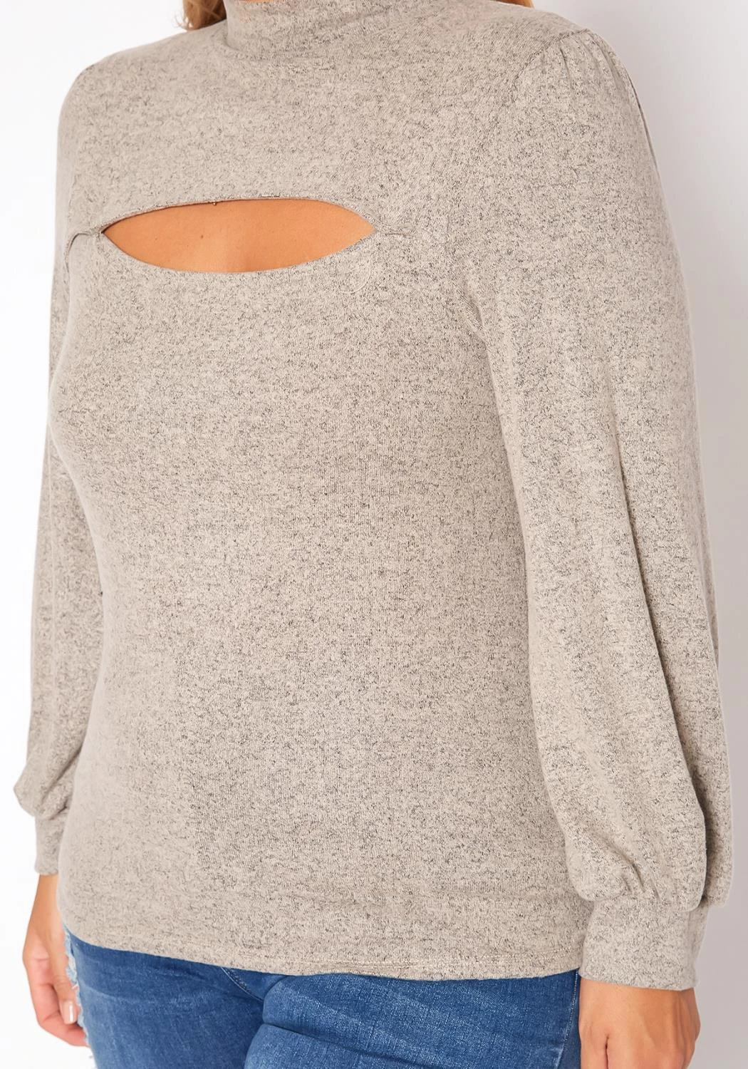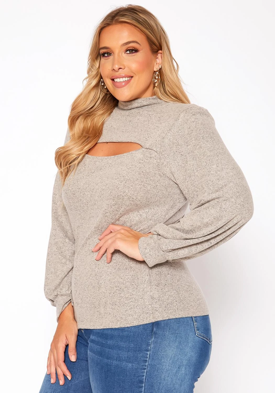 Lovely knit top for plus size women which features a keyhole front detail, mock neck style and long sleeves with fitted wrist cuffs.