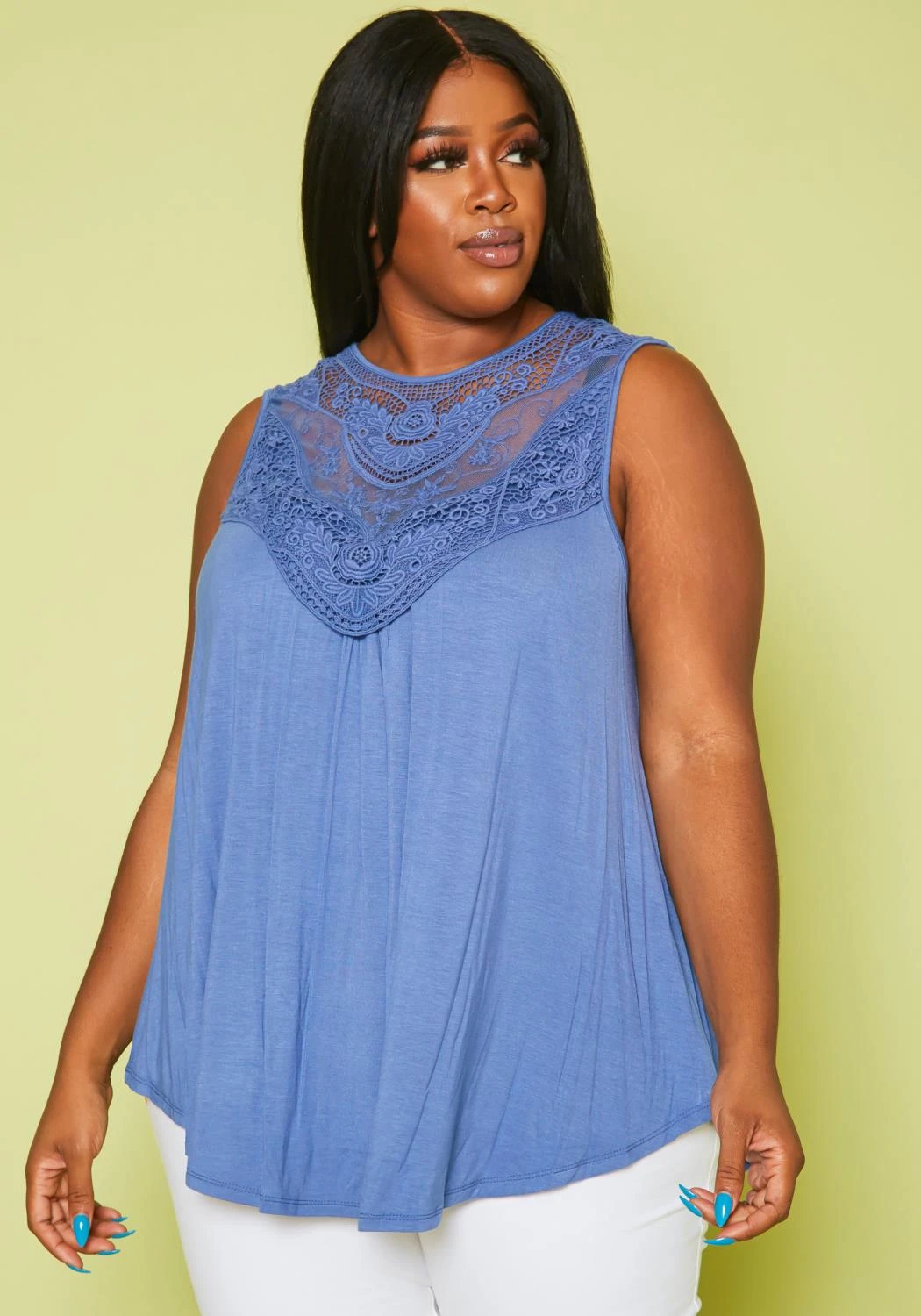 Plus size women’s casual top with lace hem design, sleeveless style, round neck style, flare hem and back neck button closure.
