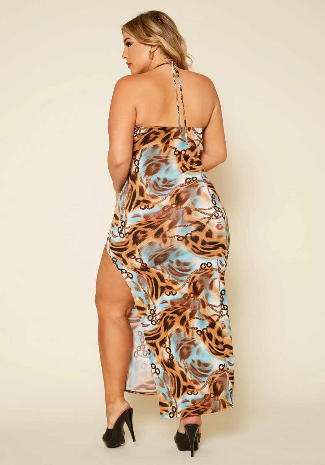 Plus size women’s dress in a tie up closure halter neck style, featuring a sexy front cutout and side slit detail.