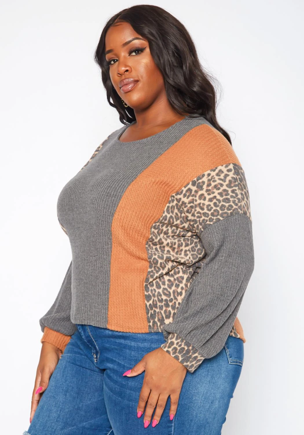 Plus size women’s sweater in waffle knit material, color block design, leopard print, fitted wrist cuffs and round neck style.