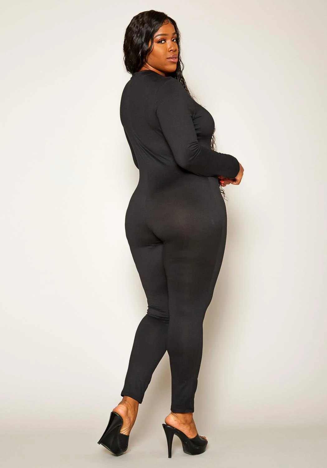 Basic plus size women’s jumpsuit in mock neck style, zipper front hem, long sleeves and butter soft fabric.