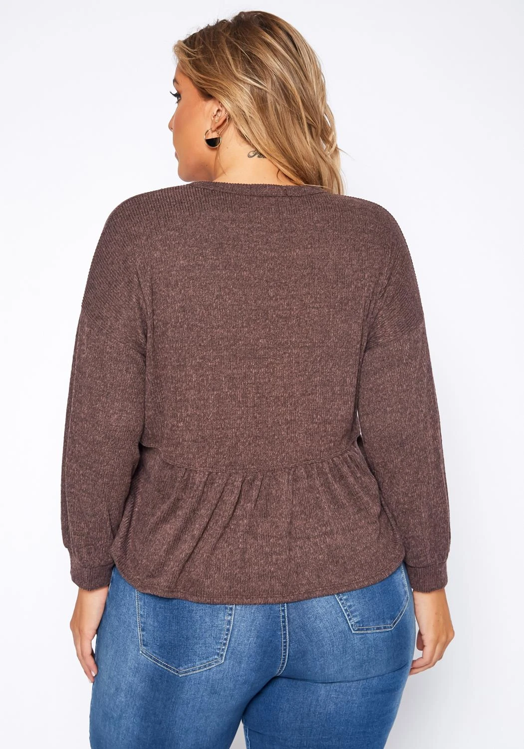 Lovely plus size women’s knit top in peplum flare design, v-neck style, button hem and long sleeves with fitted wrist cuffs.