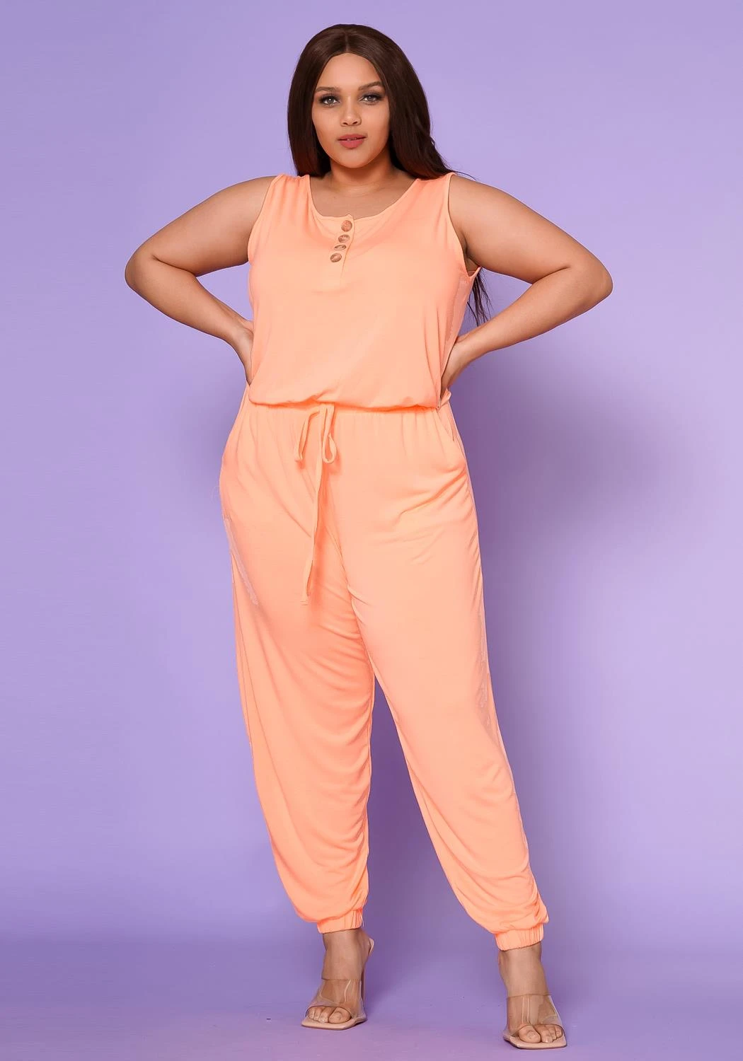 Plus size women’s jumpsuit in sleeveless style featuring round neck ascent, front button closure detail, elastic waistband ascent and drawstring detail.