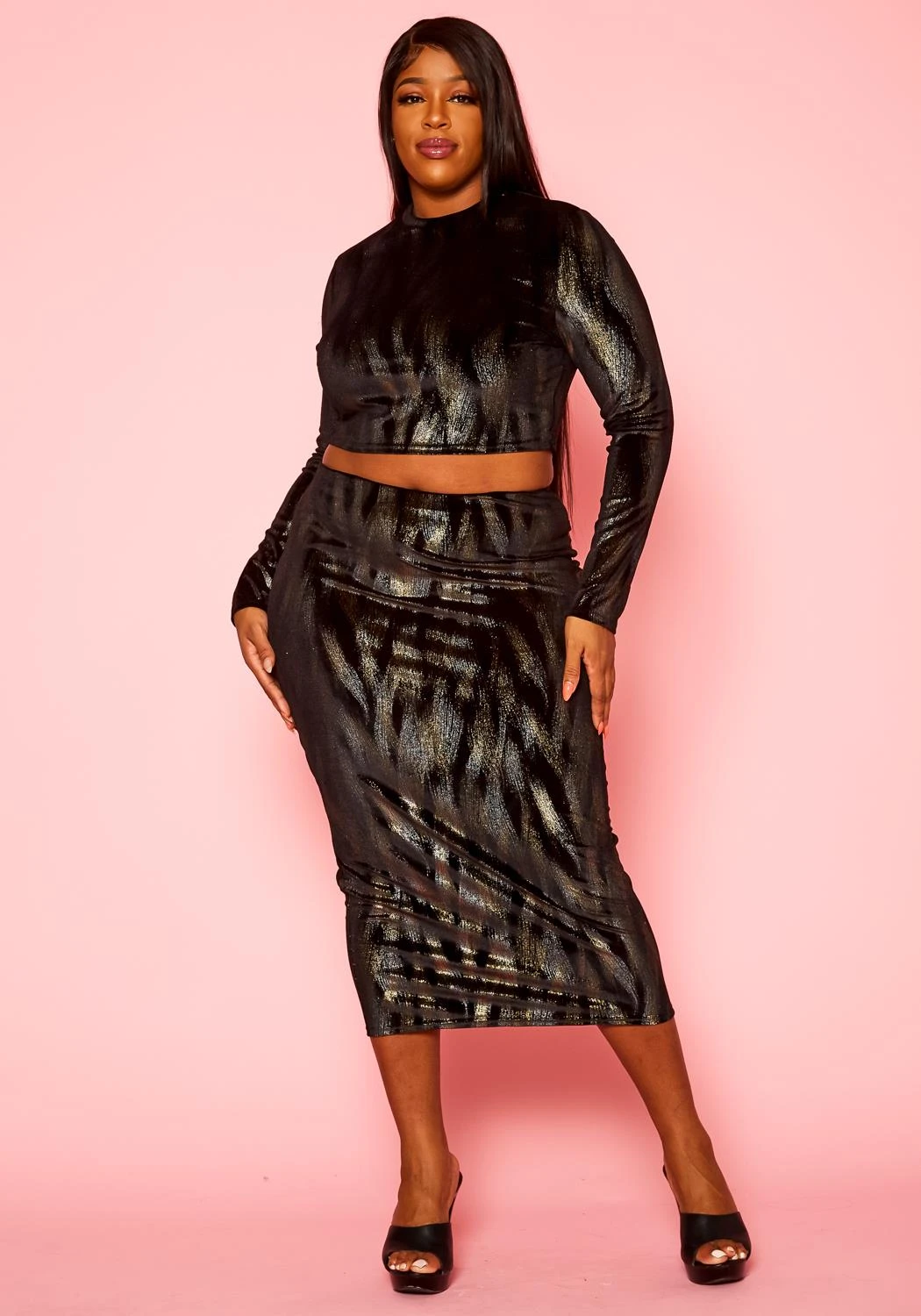Gorgeous plus size women’s matching setin metallic pattern. Features a long sleeve crop top and high waist maxi skirt.