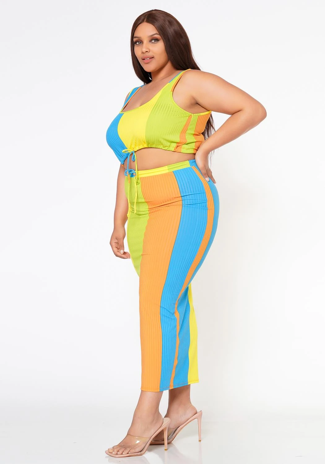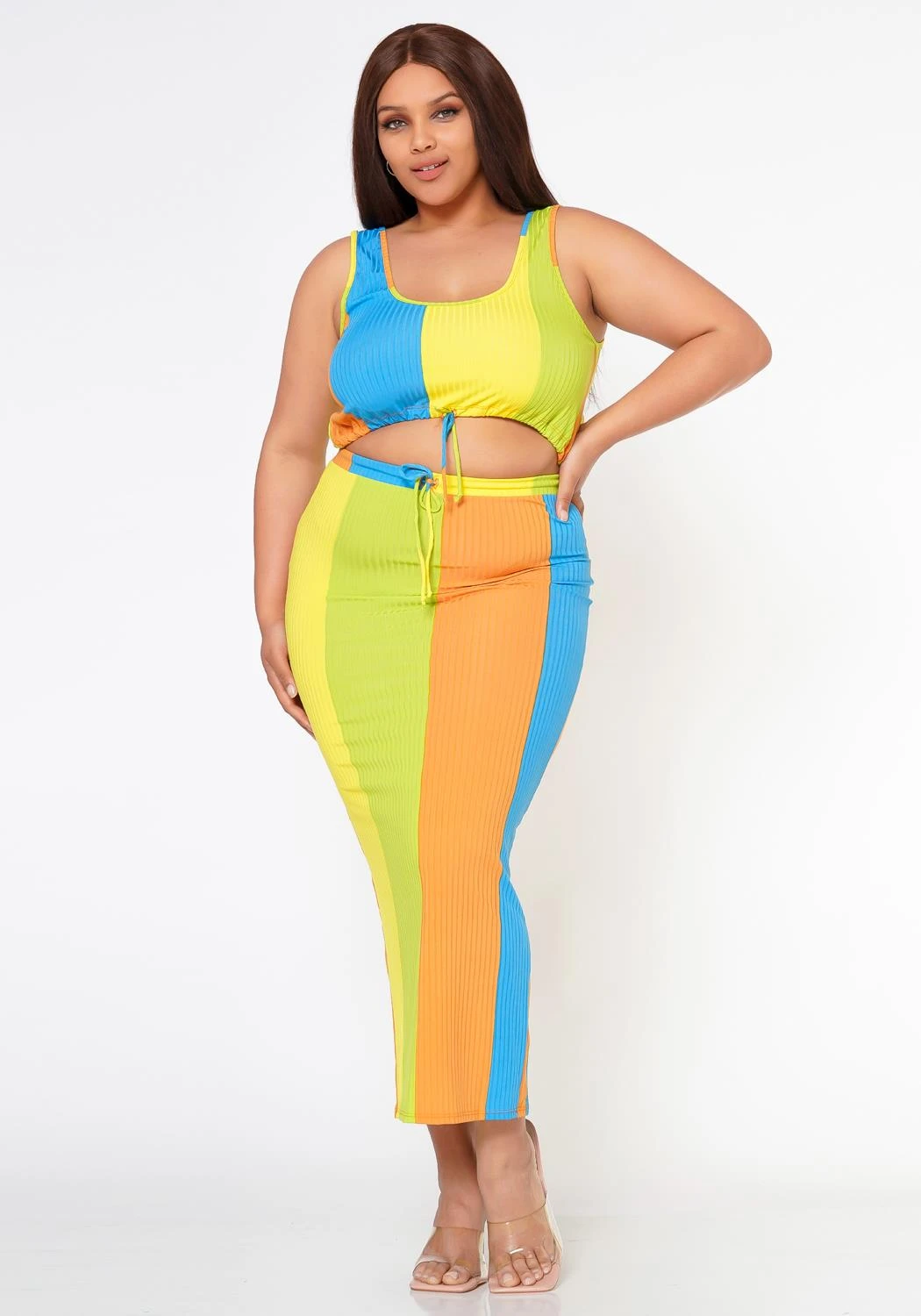 Trendy plus size women’s lounge set in multi color. Features a scoop neckline tank top with waist drawstring hem and matching high waist bodycon midi skirt with waist drawstring hem.