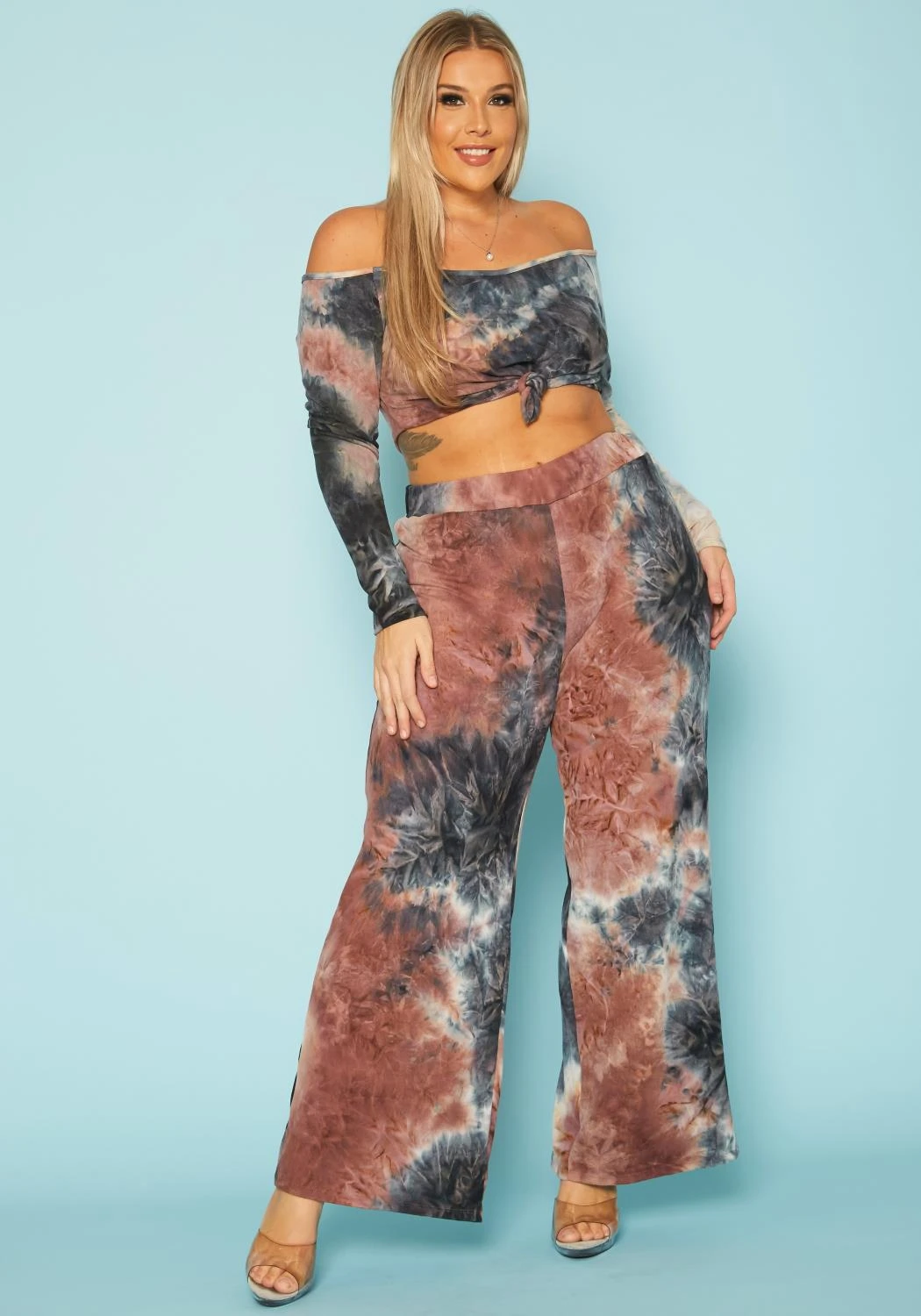 Plus Size Multi Print Crop Top & Flare Pants Set