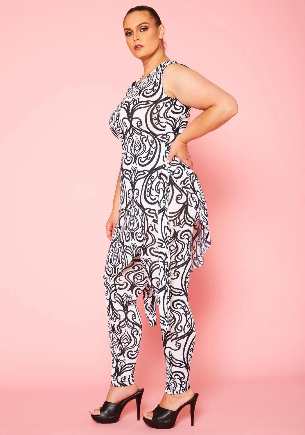Plus size women’s set, featuring a asymmetrical top, sleeveless, round neck hem with side tie up detail paired with high waist leggings.