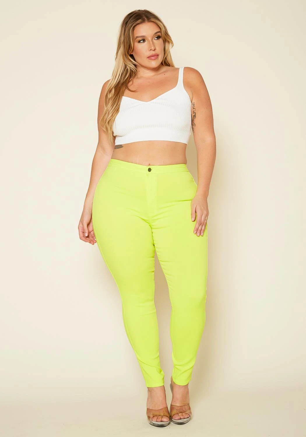 Favorite summer jeans for plus size women in high waist style, skinny jean fitting and back pocket hem.