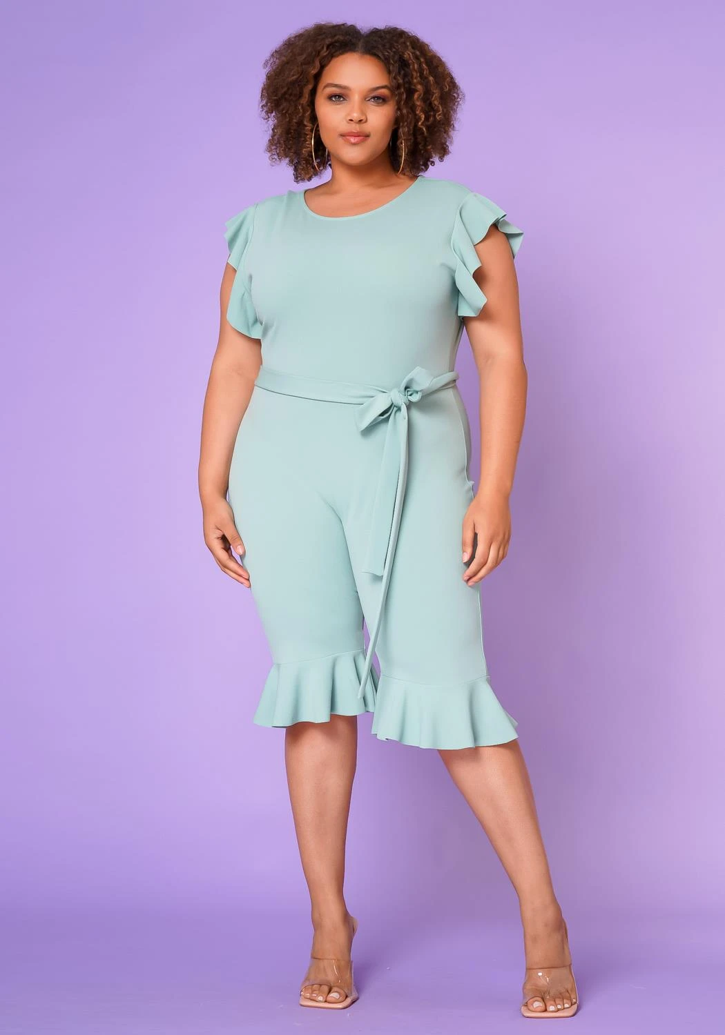Plus size woman’s biker romper with ruffle detailing a round neck and waist tie accent.