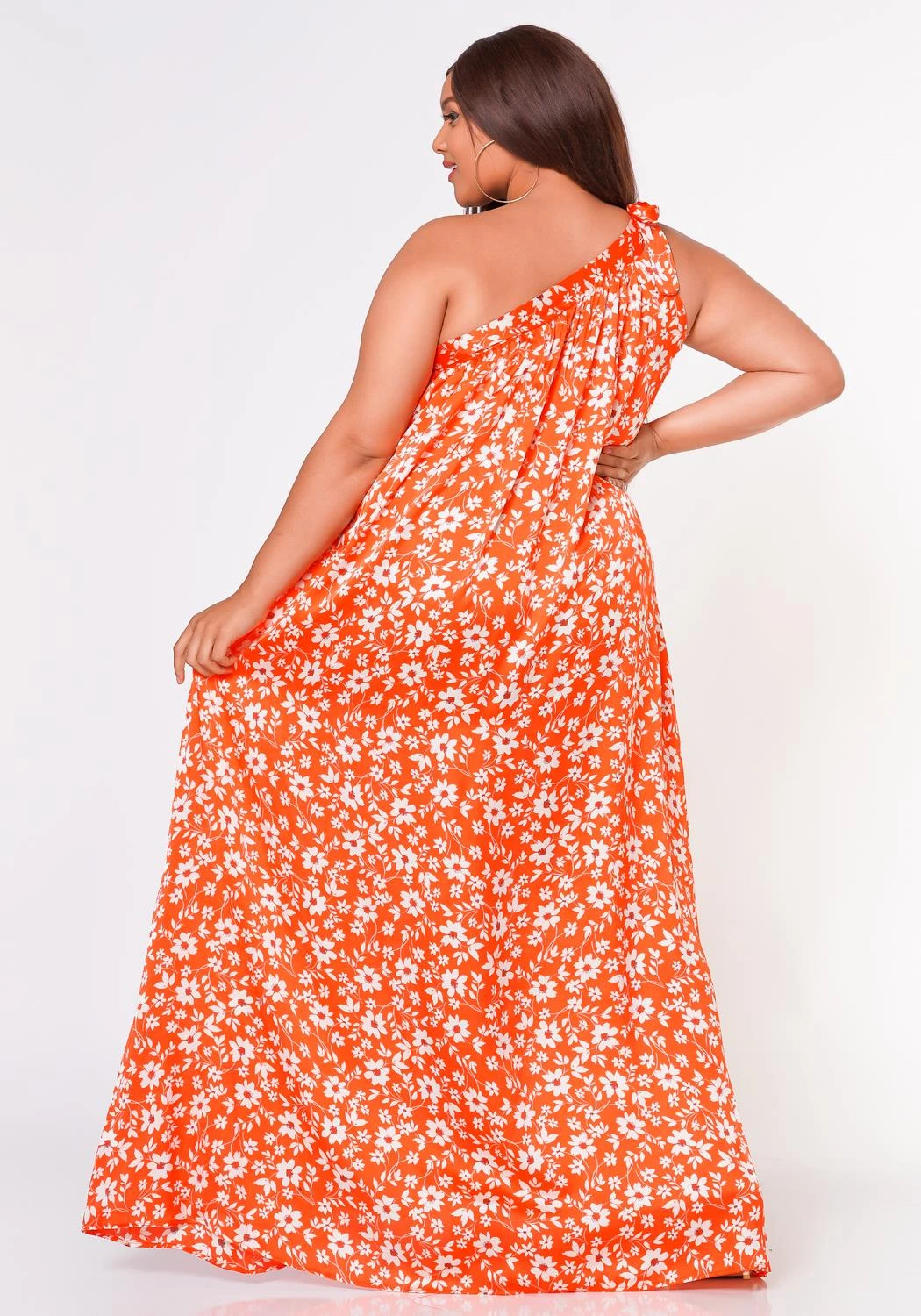 Plus size women’s maxi dress featuring a one sleeve self tie hem with side pocket detail and floral pattern.