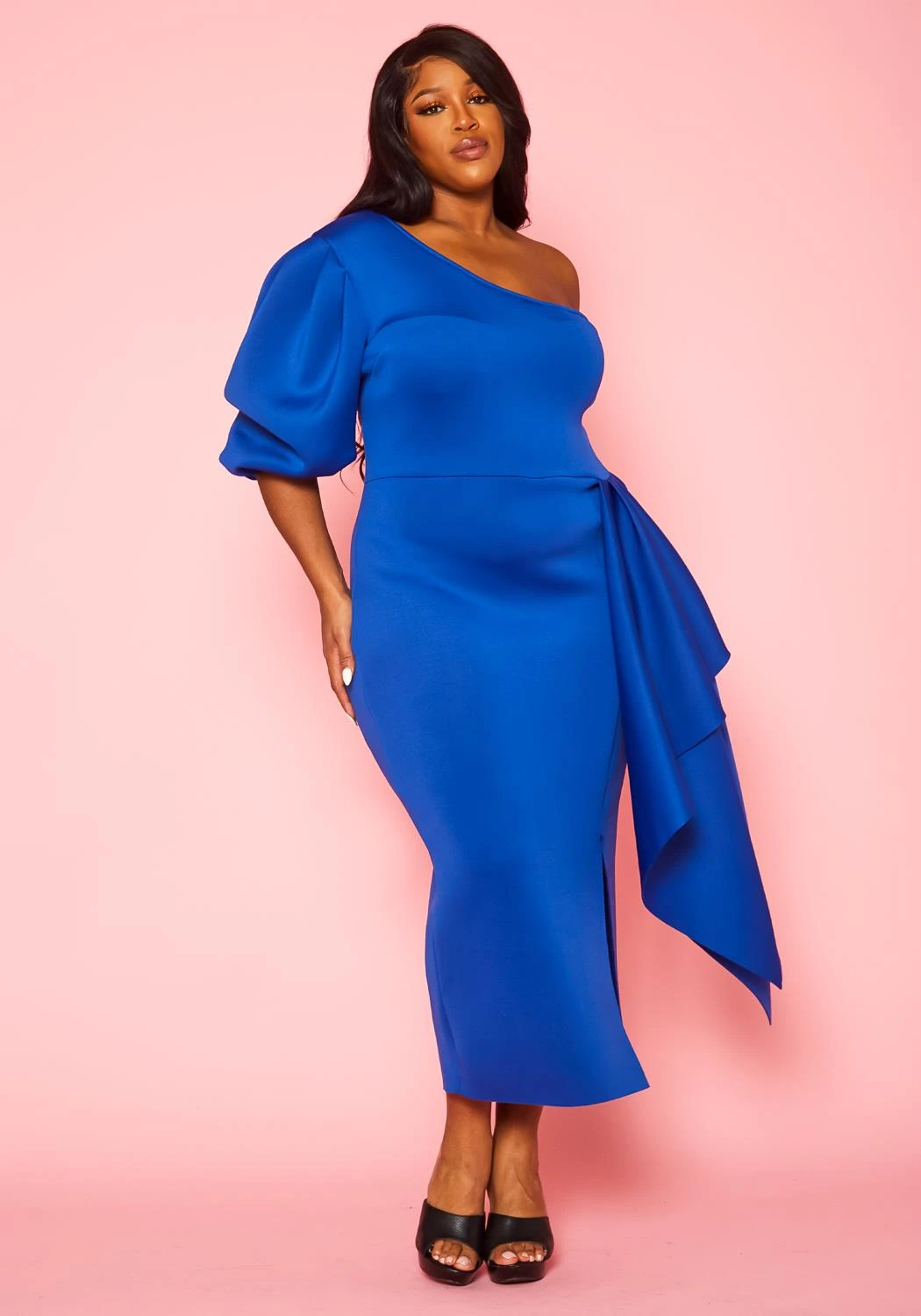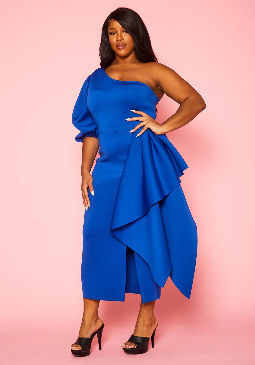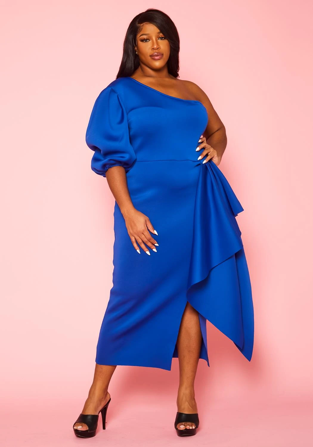 Memorable plus size women’s gown in one sleeve style, drape front details and back zipper closure.