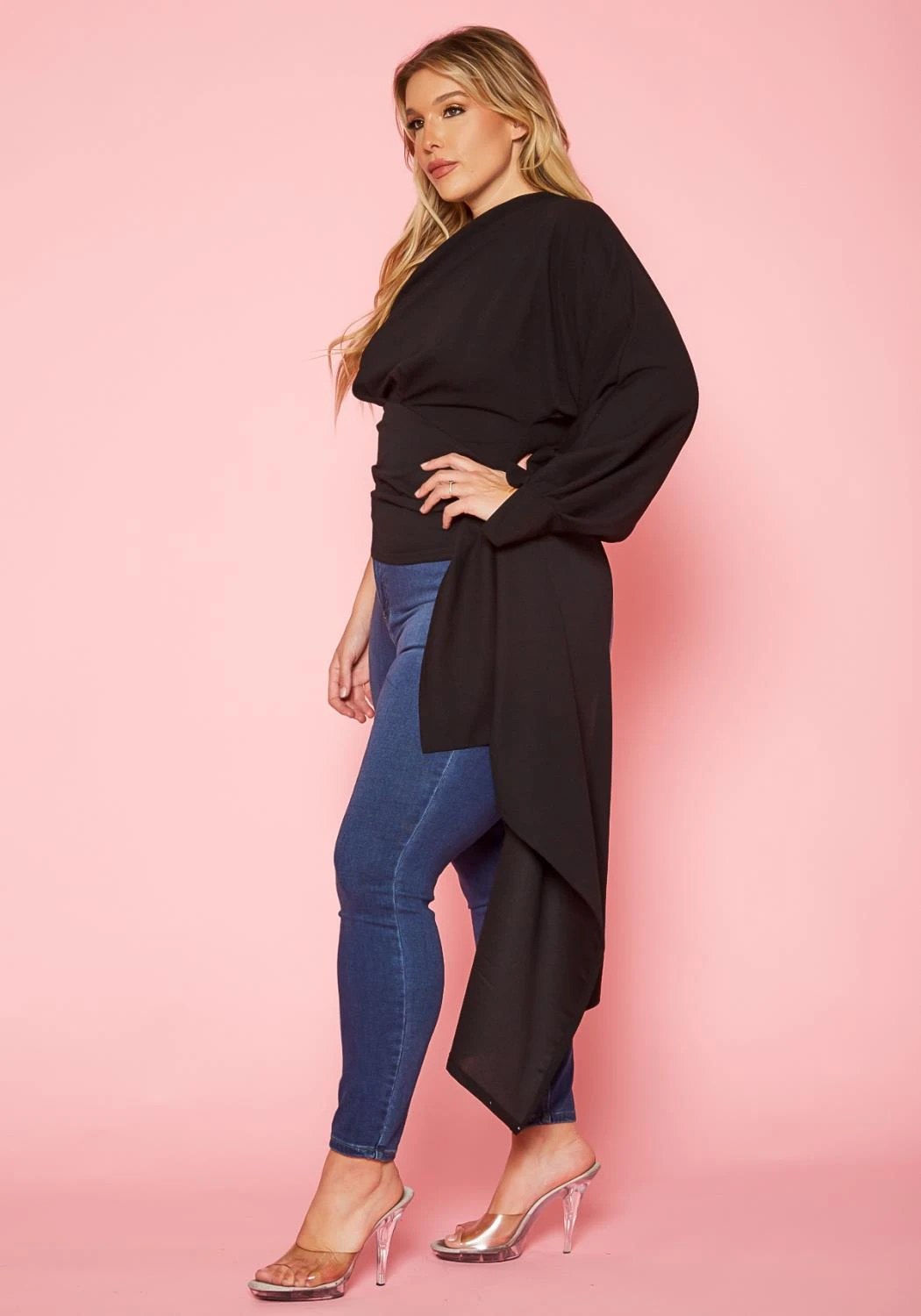 One of a kind plus size women’s blouse in one sleeve design, drape hem detail and fitted hem.