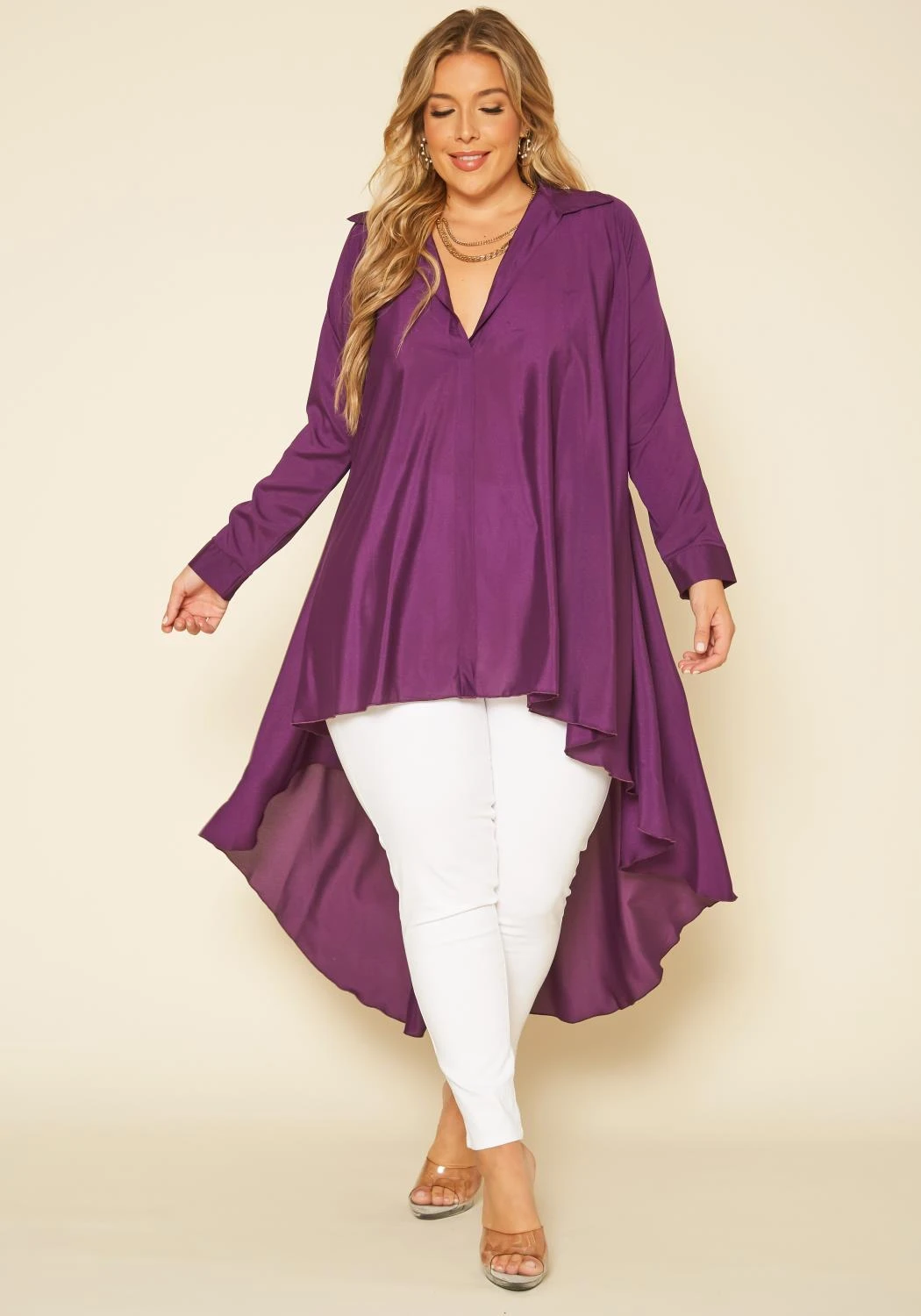 Make a fabulous impression in this plus size women’s chiffon blouse! Features high to low style and open collar ascent. *Material is sheer.
