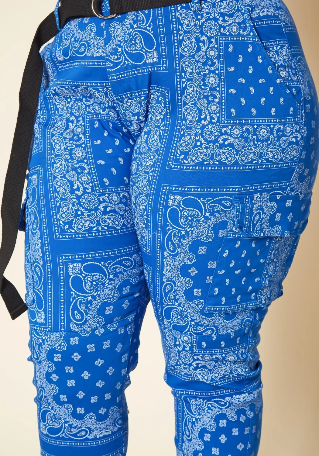 Trendy cargo pants for plus size women in paisley print, high waist style, cuffed ankle hem, D-ring waist belt and pocket details.